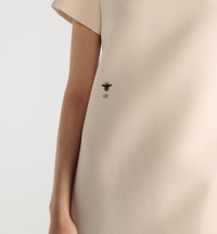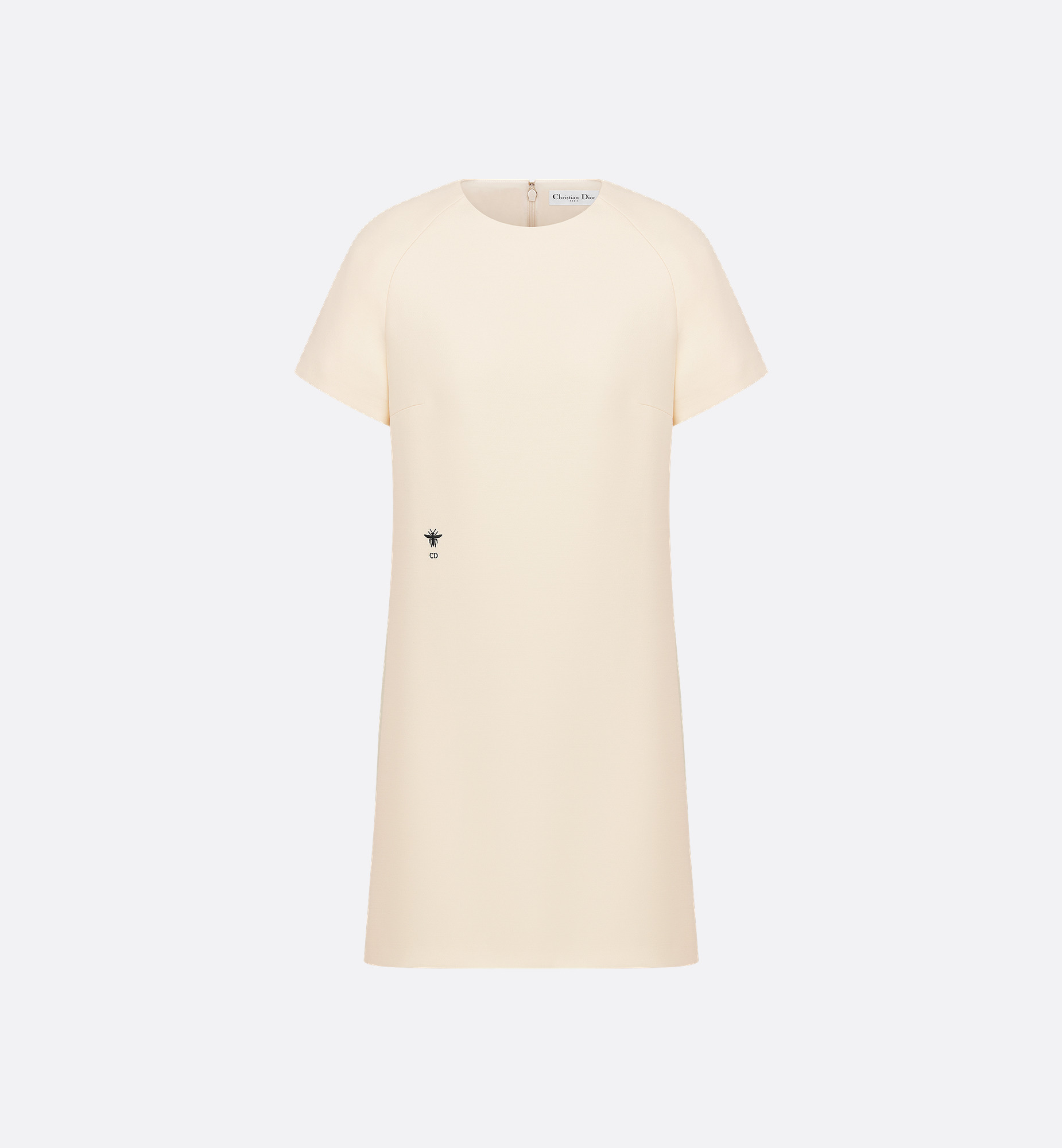 The dress is both modern and timeless. Crafted in lightweight white wool and silk, its straight silhouette is enhanced by short sleeves and a round neckline that accentuates its streamlined aesthetic. The dress can be styled with any piece from the wardrobe for an elegant and modern look. - Embroidered bee - Back zip closure - Side welt pockets - Lined - 77% wool, 23% silk - Made in France Size & Fit - Regular fit - Cropped silhouette - Size 34: shoulder-to-shoulder width: 37 cm / 14.5 inches, chest size: 88 cm / 34.5 inches, outside and inside sleeve lengths: 16 and 5.5 cm / 6.5 and 2 inches, hip circumference: 90 cm / 35.5 inches, garment length: 84 cm / 33 inches - Size 36: shoulder-to-shoulder width: 38 cm / 15 inches, chest size: 90 cm / 35.5 inches, outside and inside sleeve lengths: 17.5 and 5.5 cm / 7 and 2 inches, hip circumference: 94 cm / 37 inches, garment length: 86 cm / 34 inches - Size 38: shoulder-to-shoulder width: 39 cm / 15.5 inches, chest size: 94 cm / 37 inches, outside and inside sleeve lengths: 18 and 5.5 cm / 7 and 2 inches, hip circumference: 98 cm / 38.5 inches, garment length: 88 cm / 34.5 inches - Size 40: shoulder-to-shoulder width: 39 cm / 15.5 inches, chest size: 96 cm / 38 inches, outside and inside sleeve lengths: 19 and 6 cm / 7.5 and 2.5 inches, hip circumference: 100 cm / 39.5 inches, garment length: 89 cm / 35 inches - Size 42: shoulder-to-shoulder width: 40 cm / 15.5 inches, chest size: 100 cm / 39.5 inches, outside and inside sleeve lengths: 20 and 6 cm / 8 and 2.5 inches, hip circumference: 104 cm / 41 inches, garment length: 89 cm / 35 inches - Size 44: shoulder-to-shoulder width: 40 cm / 15.5 inches, chest size: 104 cm / 41 inches, outside and inside sleeve lengths: 20 and 6 cm / 8 and 2.5 inches, hip circumference: 110 cm / 43.5 inches, garment length: 92 cm / 36 inches - Size 46: shoulder-to-shoulder width: 43 cm / 17 inches, chest size: 108 cm / 42.5 inches, outside and inside sleeve lengths: 20 and 6 cm / 8 and 2.5 inches, hip circumference: 112 cm / 44 inches, garment length: 92 cm / 36 inches - Each measurement may have a normal variation of 2 cm / 0.75 inch - Using our personalized tool will provide you with the best size recommendation - For more information, please review the size guide
