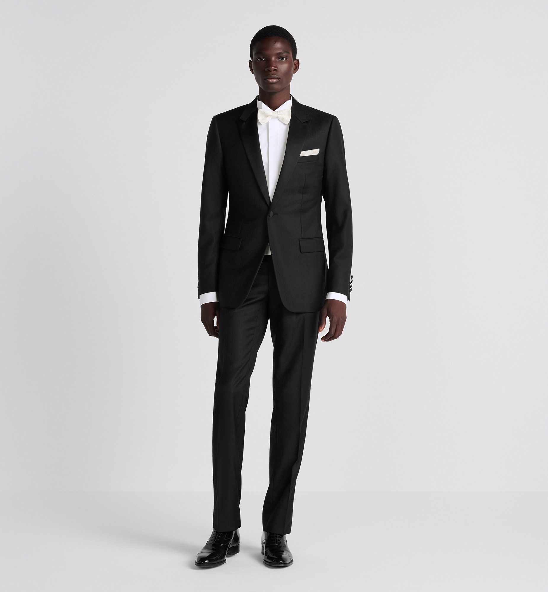 Tailoring is at the heart of House heritage and is the very essence of the Dior ateliers' savoir-faire. Celebrating this unique expertise, the suit revisits elegant tuxedo signatures. Crafted in wool and silk jacquard that's silky to the touch, the black tuxedo can be worn in any season. The single-breasted jacket is characterized by its peak lapels and satin-covered buttons. It has a modern and sophisticated cut with elegant draping, while the regular-fit pants are enhanced by satin inserts on the sides. The tuxedo can be completed by a shirt and bow tie for a more elegant look on any special occasion. - Jacket: - Single-breasted with silk-covered button - Shiny peak lapels - Rear vent - Chest pocket and side flap pockets - Four interior pockets, including a large pocket with a Dior signature-engraved button - 92% virgin wool, 8% silk - CD signature lining: 100% cupro - Pants: - Creases at the front and back - Side welt pockets - Rear piped pockets with concealed button - Concealed zip and hook closure and button - Shiny side stripes - 92% virgin wool, 8% silk - Lining: 100% cupro - Made in Italy Size & Fit - Classic-fit jacket - Back length: 75 cm / 29.5 inches (size 48R) - Regular-fit pants - Leg opening: 19 cm / 7.5 inches (size 48R) - The model measures 187 cm / 73.5 inches and the item shown is in size 48 (FR) - Using our personalized tool will provide you with the best size recommendation - For more information, please review the size guide