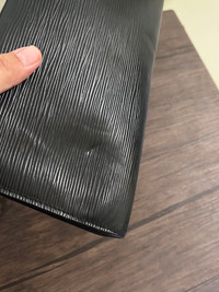 This is an authentic LOUIS VUITTON Epi Pochette in Black. Crafted from signature textured Epi leather, this chic pouch features a structured silhouette with a top zipper closure and gold-tone hardware. The interior is lined with a soft microfiber and is ideal for carrying your essentials with effortless sophistication. Sold as is. The exterior presents minor dent marks, while the interior is clean and well- maintained. The strap shows signs of splitting, and the zipper head will need replacement for full functionality. Bag only. Please check all photos for details, they form part of the descriptions.