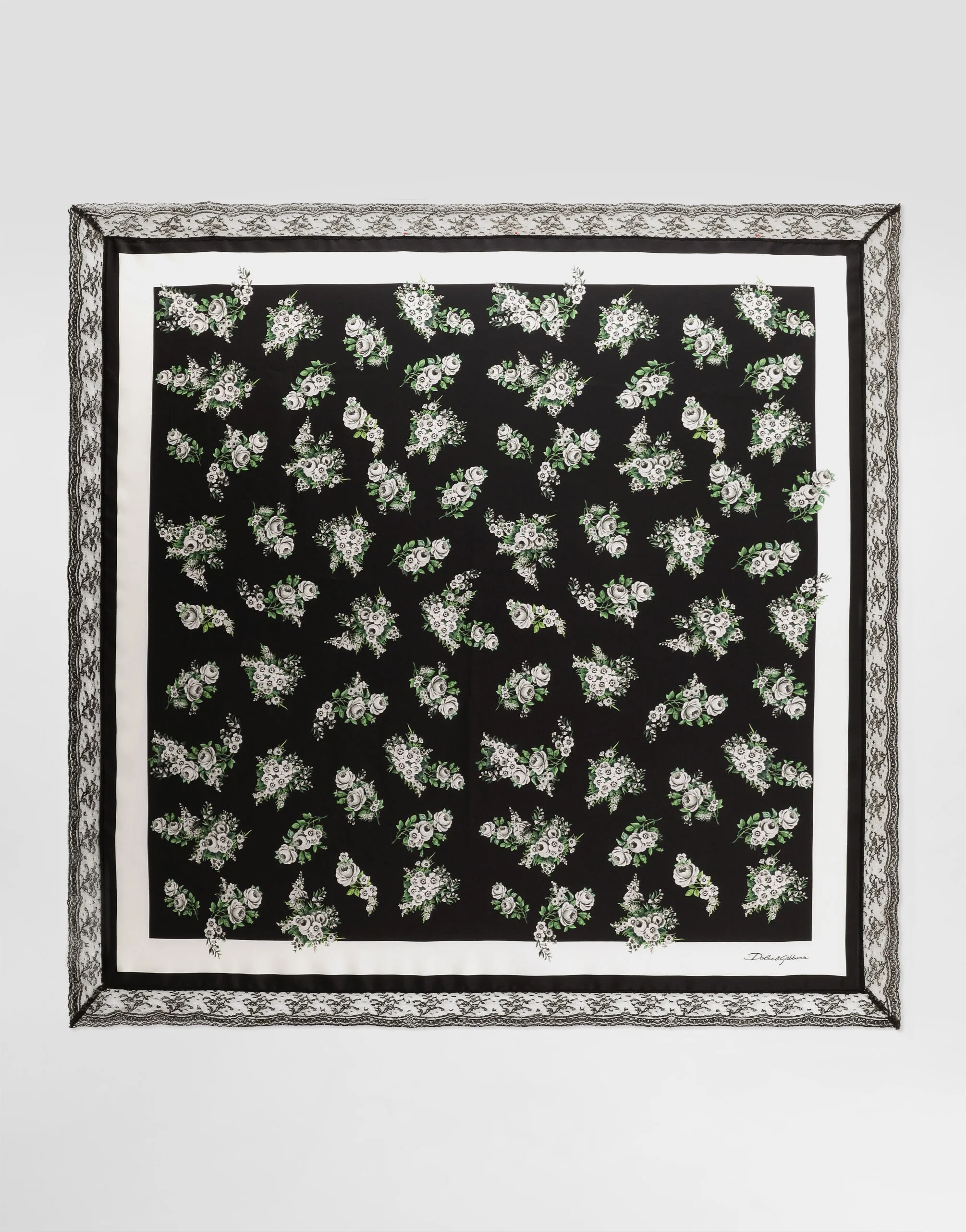 The SS26 Women's Fashion Show Collection is the result of a play of harmonious contrasts: masculine and feminine, day and evening, tailored and casual. Pyjamas take centre stage, paired with lingerie and formal garments. The play of layers and the mix of different influences contribute to expressing the relaxed attitude and unique, original style at the heart of the collection. This scarf combines the elegance of silk twill with the delicacy of the lace insert, creating a sophisticated and versatile accessory for any occasion. Small flower bouquet-print silk twill scarf with lace insert: • Multi-colored • Measurements: 90x90 cm • Hand-stitched hem on all four sides • Made in Italy The difference in the print placement that you may find on this product is a feature of Dolce&Gabbana’s “Handmade” pieces. A detail that makes every garment or accessory unique and exclusive. External Composition: 90% Silk, 5% Polyamide, 5% Viscose