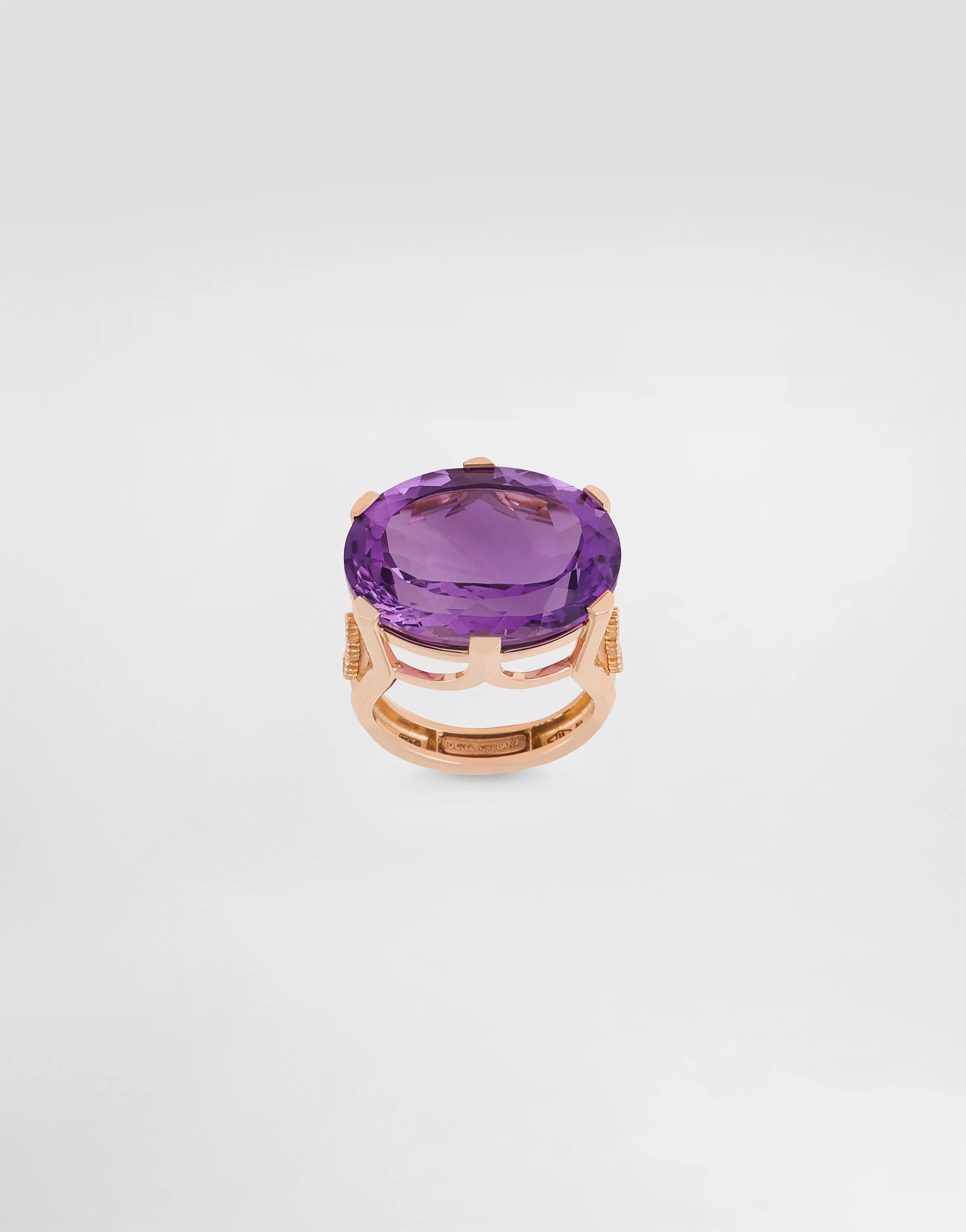 DOLCE&GABBANA, with the “Anna” collection, celebrates the concept of variety and exuberance. Color becomes the expressive language of these jewels. Each jewel evokes in its appearance the art, richness, harmony and colors of Italian gardens, in a sophisticated alternation capable of enhancing the idea of ??diversity and uniqueness. Technical specifications: Gold 750/000 Gemological details: Amethysts ring 1 amethyst (quartz variety): transparent, purple color, oval shape, mixed cut Weight: 18.50 cts approximately 6 diamonds: transparent, colorless, round shape, brilliant cut Total weight: 0.10 ct approximately; VVS-VS; color: D-G 18 kt red gold