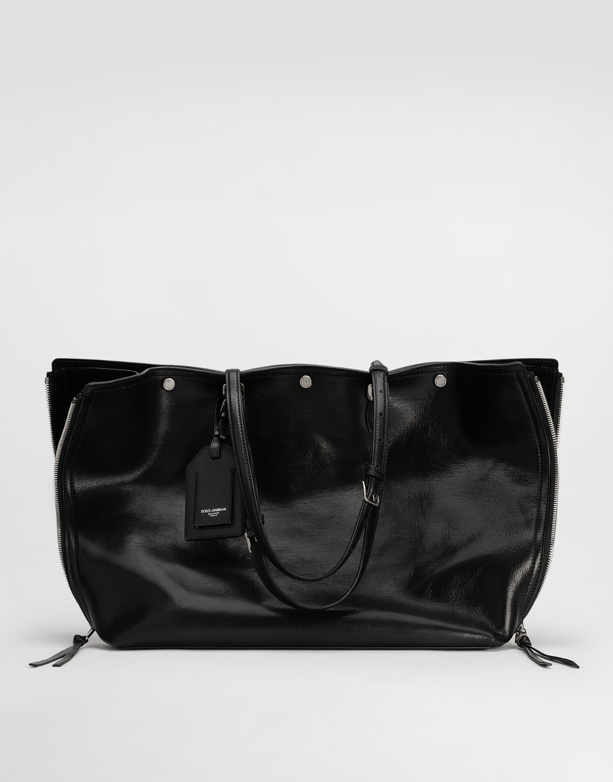 The scene is set for Dolce&Gabbana's distinctive and iconic aesthetic codes in the Collection from Men's Fall/Winter 2025 Fashion Show. The evening lights up with radiant brooches and is enriched with classic suits and blazers of timeless elegance. The Atene shopping bag, made of fine bull calfskin, is perfect for those looking for elegance and functionality in a single accessory. The foil stamp and the galvanic button closure in matt old titanium nickel enhance its exclusive design. Atene calfskin shopping bag: • Black • Leather handles • Buttons closure • Matt old titanium nickel plating • External and internal customization with stamp with film • Removable pouch • Item equipped with a logo bag and a pre-assembled box • Measurements: H35.5 x W40 x D12 cm • Made in Italy External Composition: 95% Calfskin, 5% PVC Internal Composition: 90% Calfskin, 10% Cotton