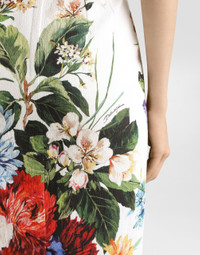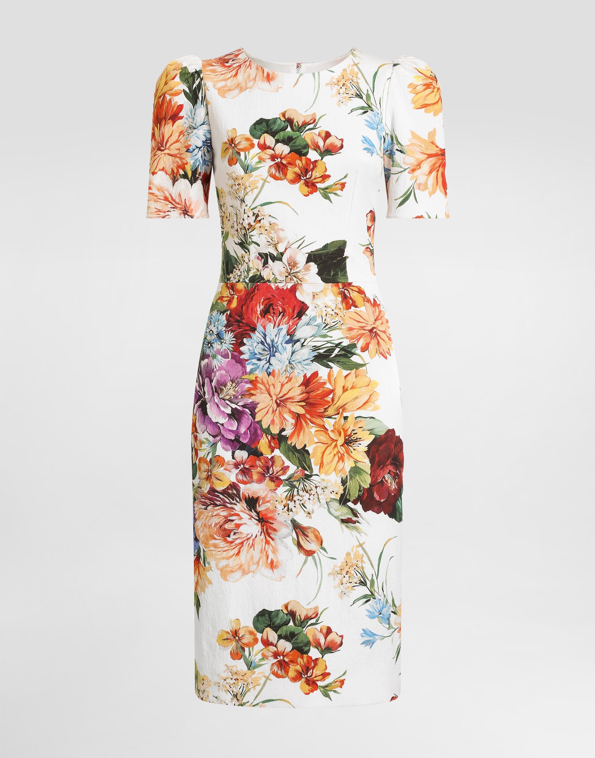 This dress is perfect for special occasions, combining elegance and sophistication with a sheath design that flatters the feminine silhouette. Cretonne dress with Bouquet print: • Multi-coloured • Fitted fit • Short sleeves • Bodice with slightly boat neckline • Sheath skirt with slit at the bottom • Opening in the center back with covered chain zip • Lined, except sleeves • The model is 175 cm tall and wears size 40 IT • Made in Italy The difference in the print placement that you may find on this product is a feature of Dolce&Gabbana’s “Handmade” pieces. A detail that makes every garment or accessory unique and exclusive. External Composition: 48% Cotton, 48% Viscose, 2% Elastane, 2% Polyamide Internal Composition: 91% Silk, 9% Elastane