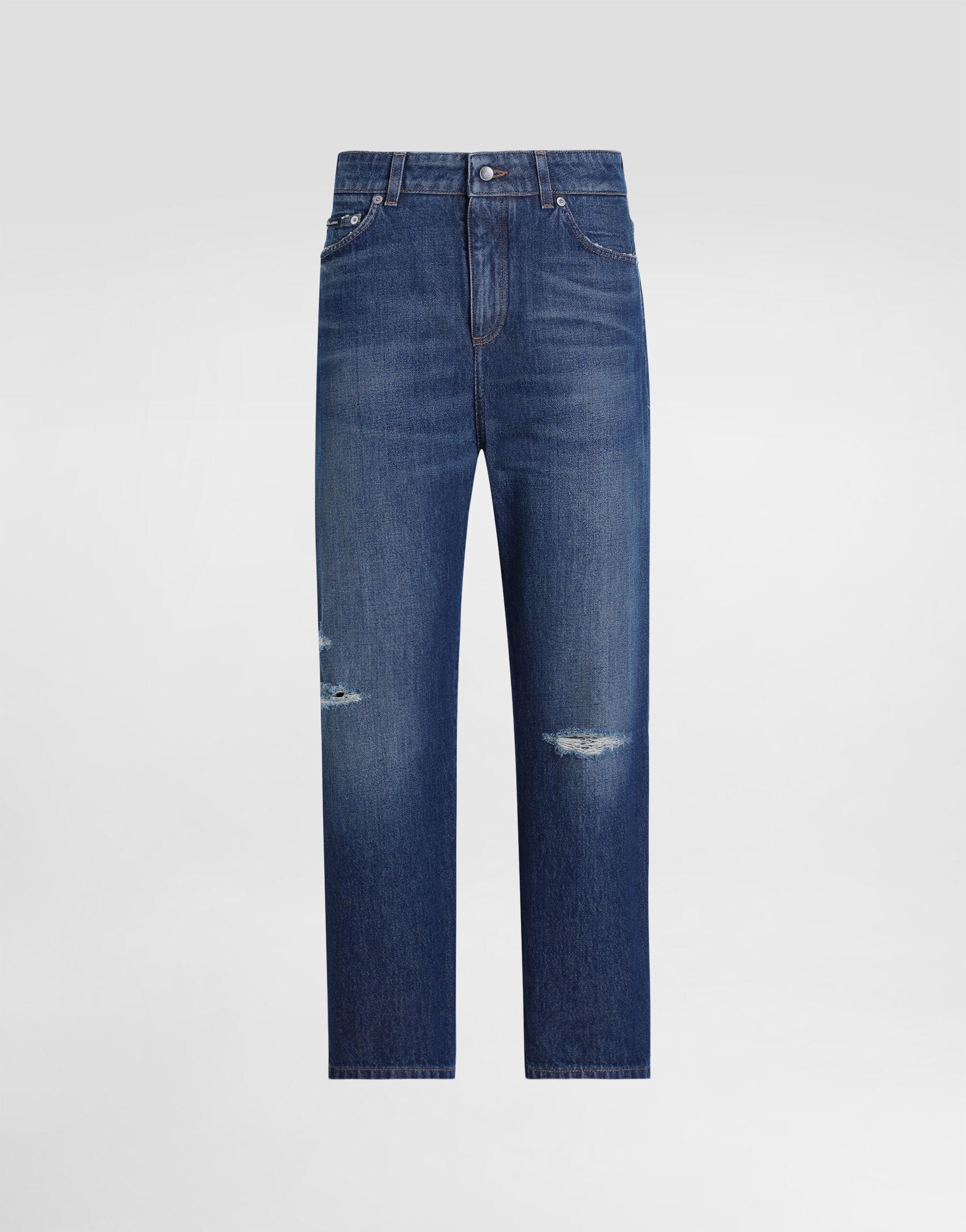 Cotton denim boyfriend jeans with rips: • Blue • Regular rise • 5 pockets • Branded label on the coin pocket • Branded metal and leather tag on the back pocket • Inner leg: 71 cm • Hem: 20 cm • Zipper and branded metal button fastening • The model is 175 cm tall and wears a size IT 40 • Made in Italy External composition: 100% Cotton