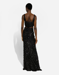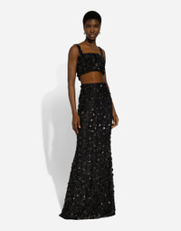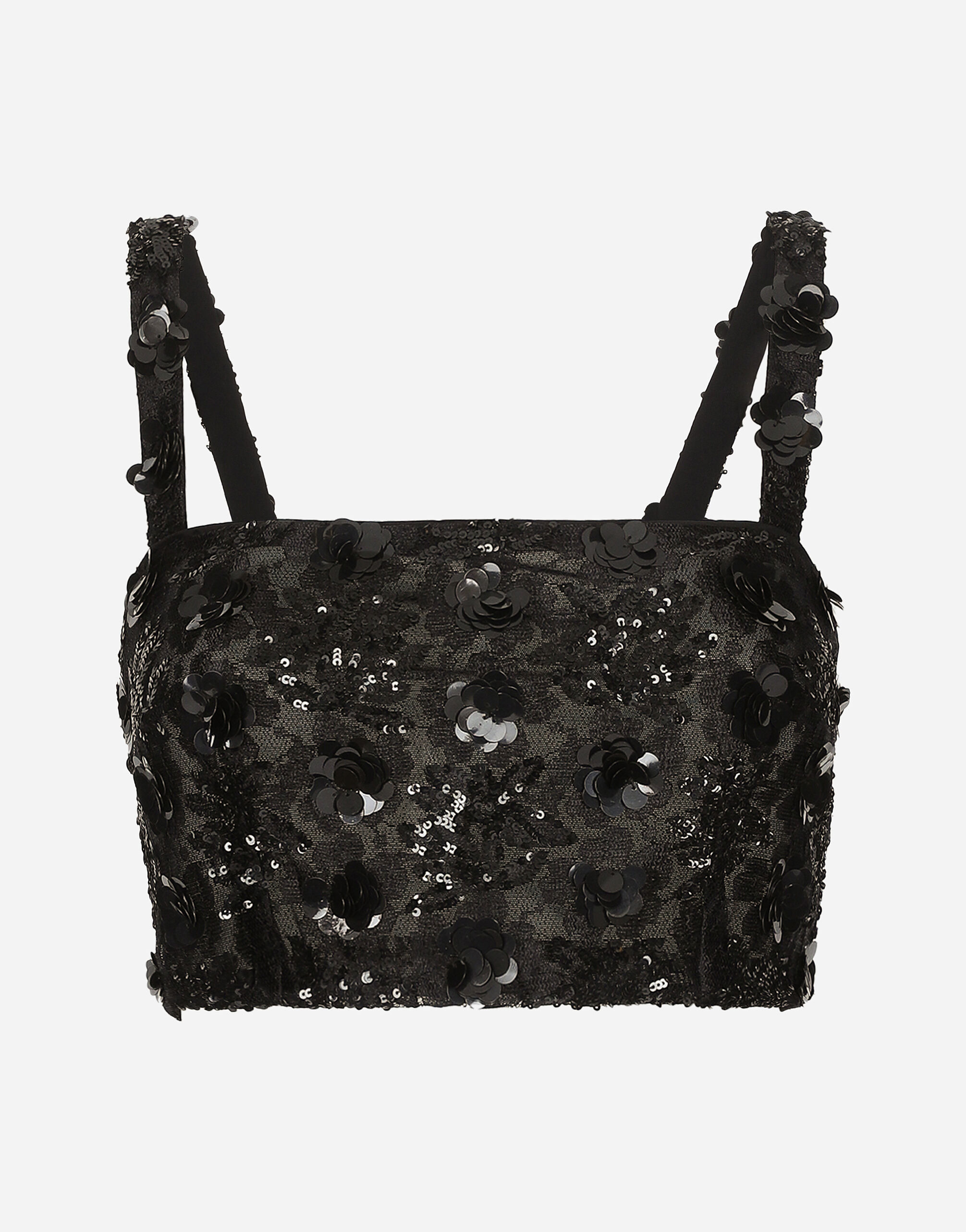 Inspired by 80s fashion photography, the Black Sicily collection masterfully blends masculine and feminine elements, pairing tailored cuts and corset details for the FW 24/25 season. A new vision of the iconic Nero Sicilia black is conveyed through contemporary and sensual looks: jackets and skirts in all-over glen plaid pair with openwork socks, while the 50s-inspired Mun shoes with Eva heel go with the houndstooth Sicily bag featuring crocodile-print leather inserts. Bralette top with sequin embroidery: • Black • Straight neckline • Sleeveless with shoulder straps • Tulle lining • Zipper fastening at the back • The model is 175 cm tall and wears a size IT 40 • Made in Italy External composition: 30% Polyamide 70% Viscose Internal composition: 92% Polyamide 8% Spandex