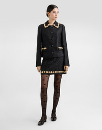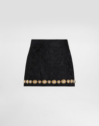 This brocade mini skirt is a distinctive piece that combines elegance and modernity. Perfect for those who love to stand out with style and class, it is ideal for special evenings or elegant events. Brocade miniskirt: • Black • Low waist • Covered zip at the center back • Chain motif at the bottom of the skirt • The model is 175 cm tall and wears size 40 IT • Made in Italy External Composition: 49% Cotton, 32% Polyester, 19% Silk Internal Composition: 93% Silk, 7% Elastane