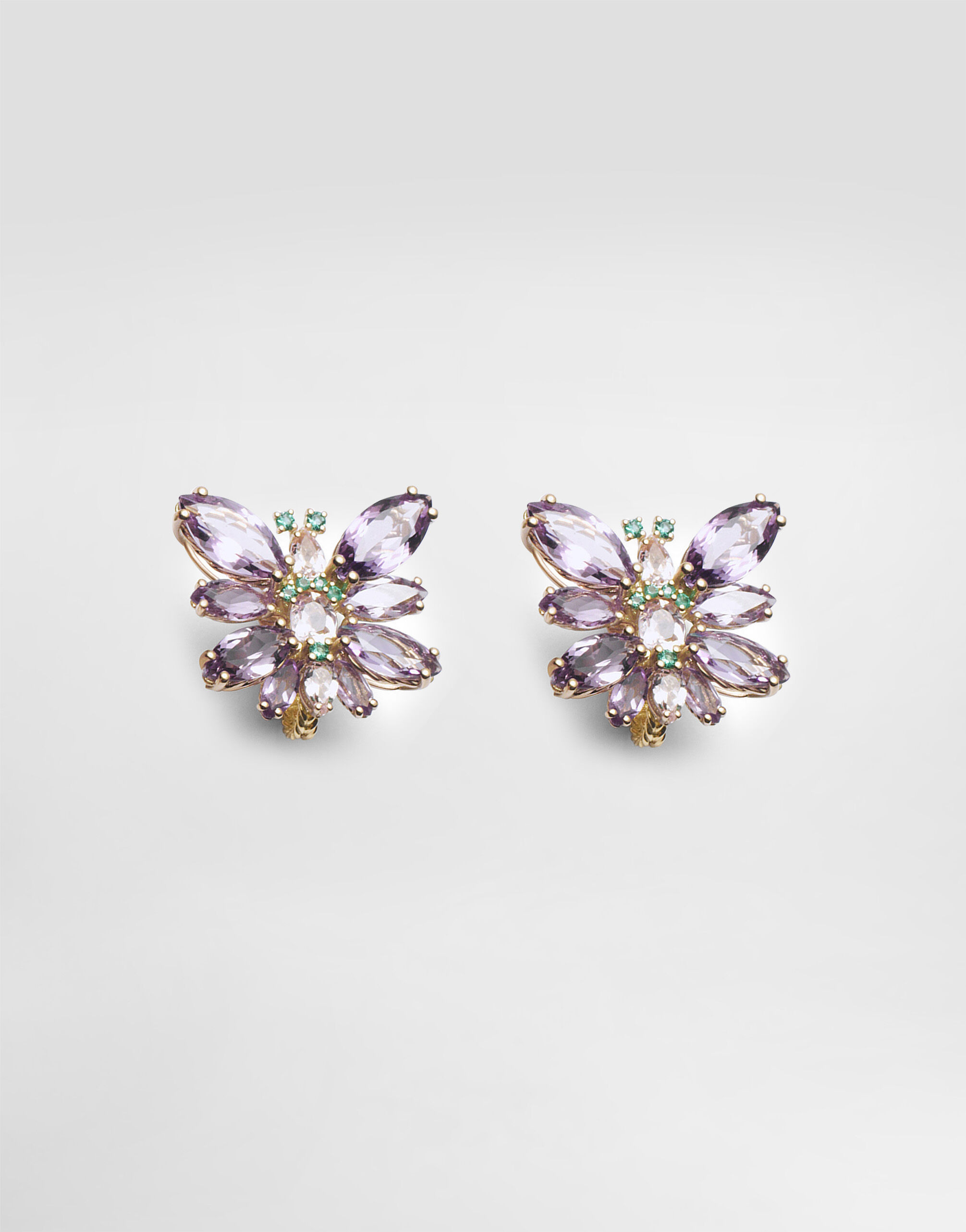 Butterfly Earrings 18-carat yellow gold, amethysts, morganites, and emeralds
