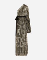 Menswear and womenswear mix and mingle, influencing one another and creating tailoring that embraces endless nuances, from the boldest to the most sophisticated, to define the rules of eternally classy femininity. A monochrome retelling in Nero Sicilia black, embellished by golden touches and rhinestones, adorning clean lines and incorporating stylish fabrics such as velvet, chiffon, lace, organza, and unique mesh details, the expression of authentic beauty for dresses, shirts and accessories. Calf-length one-shoulder lame Chantilly lace dress: • Gold • One-shoulder • Satin waistband • Unlined • Press stud fastenings on the side of the waist and a satin belt • The piece measures 114 cm from the waist down on a size IT 40 • The model is 175 cm tall and wears a size IT 40 • Made in Italy External composition: 45% Polyamide 27% Viscose 18% Polyester 10% Silk