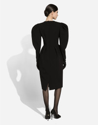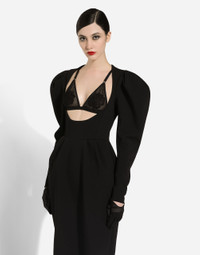 Menswear and womenswear mix and mingle, influencing one another and creating tailoring that embraces endless nuances, from the boldest to the most sophisticated, to define the rules of eternally classy femininity. A monochrome retelling in Nero Sicilia black, embellished by golden touches and rhinestones, adorning clean lines and incorporating stylish fabrics such as velvet, chiffon, lace, organza, and unique mesh details, the expression of authentic beauty for dresses, shirts and accessories. Calf-length double-breasted double stretch wool dress with open neckline: • Black • Round neckline • Long sleeves • Stretch silk satin lining • Rear zipper and hook-and-bar fastening • The piece measures 70 cm from the waist down on a size IT 40 • The model is 175 cm tall and wears a size IT 40 • Made in Italy External composition: 72% Virgin Wool 24% Polyamide 04% Spandex Internal composition: 92% Silk 08% Spandex