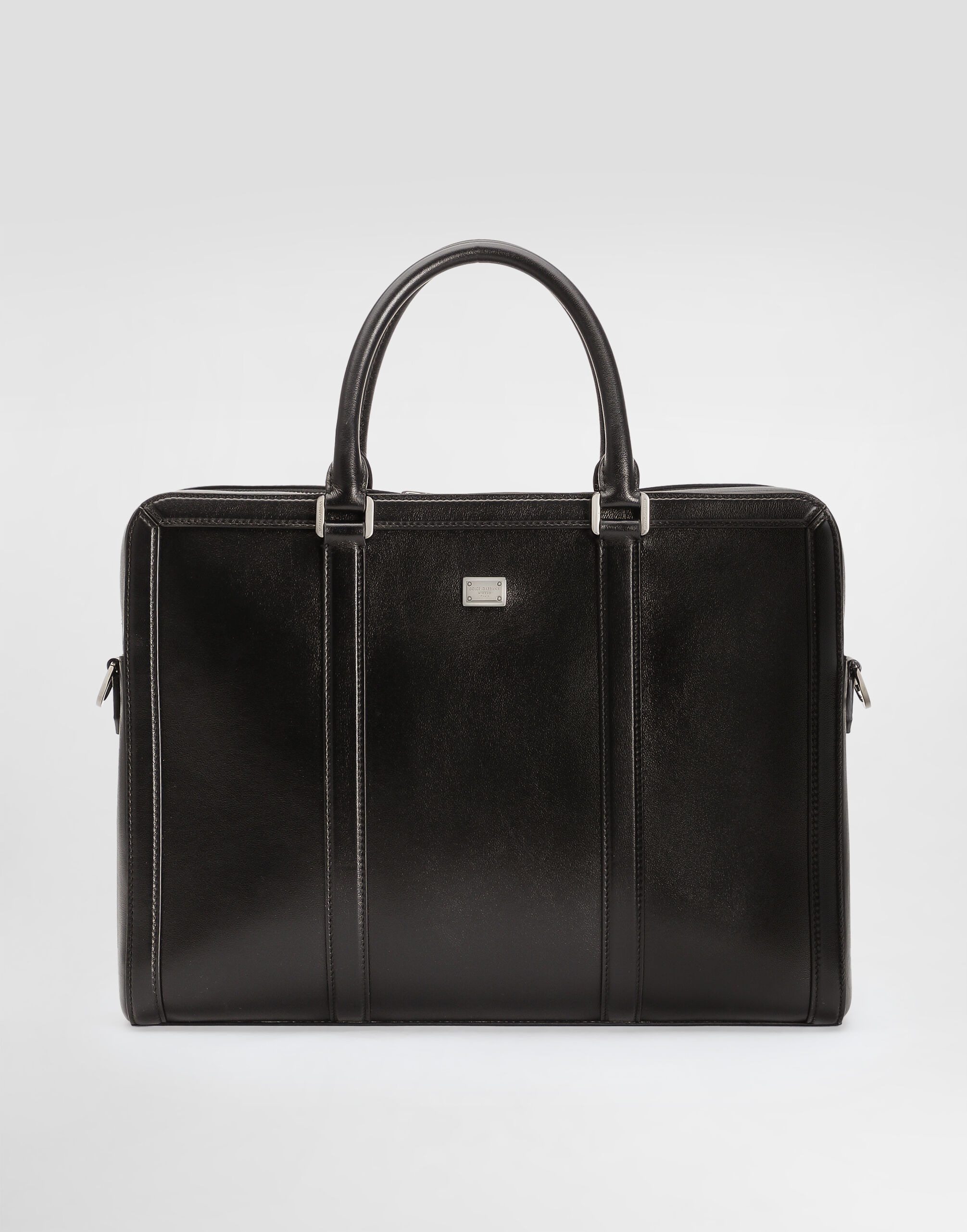 Practical and spacious, this new calfskin briefcase features a ruthenium-plated branded tag. Calfskin briefcase: • Black • Branded tag in ruthenium-plated metal • Top fastening with double zipper and slider with logo • Calfskin top handles • Adjustable and detachable crossbody strap • Fabric lining with zipped pocket and flat pocket • Item comes with a branded dust bag • Measurements: H27.5 x W37.5 x D7 • Made in Italy External composition: 100% Calfskin Internal composition: 70% Cotton 20% Acrylic 10% Calfskin
