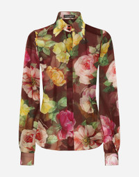 The spirit of the 1960s is taking over the new Flower Power collection. The focus is a head-to-toe floral look built around pairing and layering rose, anemone and floral bouquet maxi-prints. A cosmopolite poised between playful and sexy, this woman interprets the austerity and elegance of the 1960s, harking back to boldly opulent imagery that here at Dolce&Gabbana is condensed and reinterpreted through silhouettes, ample proportions and airy shapes, bringing femininity and sensuality to the forefront. Silk chiffon shirt with camellia print: • Multi-colored • Shirt collar • Long sleeves • Regular fit • Button fastenings with branded bottom edge • The piece measures 65 cm from the center back on a size IT 40 • The model is 175 cm tall and wears a size IT 40 • Made in Italy The difference in the print placement that you may find on this product is a feature of Dolce&Gabbana’s “Handmade” pieces. A detail that makes every garment or accessory unique and exclusive. External composition: 100% Silk