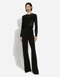 The DNA collection is distinguished by timeless shapes, bringing together three concepts: Sicilian flair, tailoring and sensuality. Nero Sicilia black and optical White predominate and pair with colors that catapult us onto the island of Sicily and make us dream. The designers channel the timeless wardrobe made up of creations that are instantly unmistakable in their simplicity, presenting us with sophisticated beauty loaded with meaning and symbolism that transcends fashion. Cashmere and silk sweater with lace inlay: • Black • 18-gauge knit • Round neck • Long sleeves • French seam armholes • Dense hand • Ribbed neck and hem • Regular fit • The piece measures 60 cm from the shoulder seam on a size IT 40 • The model is 175 cm tall and wears a size IT 40 • Made in Italy External composition: 60% Cashmere 25% Silk 12% Cotton 3% Polyamide