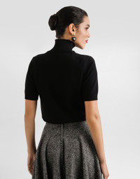 This cashmere pullover is the perfect balance between elegance and comfort. With its turtleneck design and short sleeves, it is ideal for those looking for a versatile garment to wear on different occasions. The cashmere workmanship makes it extremely soft and warm, perfect for cooler days. Cashmere pullover: • Black • Crew neck • Short sleeves • Bottom width 50 cm on size 40 IT • The model is 175 cm tall and wears size 40 IT • Made in Italy External Composition: 100% Cashmere