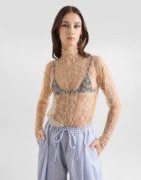 The SS26 Women's Fashion Show Collection is the result of a play of harmonious contrasts: masculine and feminine, day and evening, tailored and casual. Pyjamas take centre stage, paired with lingerie and formal garments. The play of layers and the mix of different influences contribute to expressing the relaxed attitude and unique, original style at the heart of the collection. Light and refined, this Chantilly lace blouse is perfect for sophisticated day or evening looks. The long-sleeve design with a high neckline creates a feminine and elegant aesthetic. Chantilly lace blouse: • Pink • High collar • Long sleeves • Invisible zip closure at the center back extending to the collar • The model is 175 cm tall and wears size 40 IT • Made in Italy External Composition: 53% Polyamide, 47% Viscose