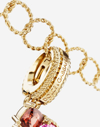 The charm is illuminated by beautiful natural gems, such as topazes, garnets, amethysts, citrines, peridots, tourmalines, and beryls: the countless shades of their colors, dominated by blue, green, purple, red, pink, and yellow, evoke the warm and sunny atmospheres of Sicily. The different shapes and various cuts of the crystals are also emphasized by the settings, which alternate twisted wire work and smooth surfaces. Light reflects and refracts on the facets of the gems and the gold in a always surprising way, maximizing the brilliance of the charms. Technical features: Gold 750/000. Gems: 1 rectangular blue "Sky" topaz with truncated corners, 1 round blue "London" topaz, 1 intense purple drop amethyst, 1 square cushion reddish-orange hessonite garnet, 1 oval pink tourmaline, 1 oval yellow citrine, 1 oval green tourmaline, 1 rectangular green/yellow peridot with truncated corners. Made in Italy. Complete the look with the twisted wire chain in yellow gold and create your favorite word. For a better fit, we recommend a distance of 5 empty rings between the pendants. Yellow 18 kt Gold