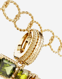 The charm is illuminated by beautiful natural gems, such as topazes, garnets, amethysts, citrines, peridots, tourmalines, and beryls: the countless shades of their colors, dominated by blue, green, purple, red, pink, and yellow, evoke the warm and sunny atmospheres of Sicily. The different shapes and various cuts of the crystals are also emphasized by the settings, which alternate twisted wire work and smooth surfaces. Light reflects and refracts on the facets of the gems and the gold in a always surprising way, maximizing the brilliance of the charms. Technical features: Gold 750/000. Gems: 1 square cushion blue "Sky" topaz, 1 oval blue "London" topaz, 1 light purple oval amethyst, 1 oval reddish-orange hessonite garnet, 1 orange drop "Madera" quartz, 1 round light yellow citrine, 1 square cushion green/yellow peridot, 1 rectangular green tourmaline with truncated corners. Made in Italy. Complete the look with the twisted wire chain in yellow gold and create your favorite word. For a better fit, we recommend a distance of 5 empty rings between the pendants. Yellow 18 kt Gold