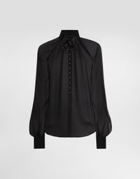 The Women's Black Sicily Collection reinforces Dolce&Gabbana's iconic fabrics and codes rooted in Italian heritage. Sensual silhouettes, highlighted by floral prints and refined corsetry, evoke an intriguing elegance, while the iconic black lace, satin, and velvet dominate the collection. Denim in various shades of blue introduces a contemporary twist, balancing the classic and modern. Embroidered crosses, medals, and jewelry add a sophisticated touch. Silk chiffon blouse with flower detailing: • Black • Mock-turtleneck with flower • Long sleeves • Decorative DG logo buttons • Regular fit • Buttons on the center back • The piece measures 62 cm from the center back on a size IT 40 • The model is 175 cm tall and wears a size IT 40 • Made in Italy External composition: 100% Silk