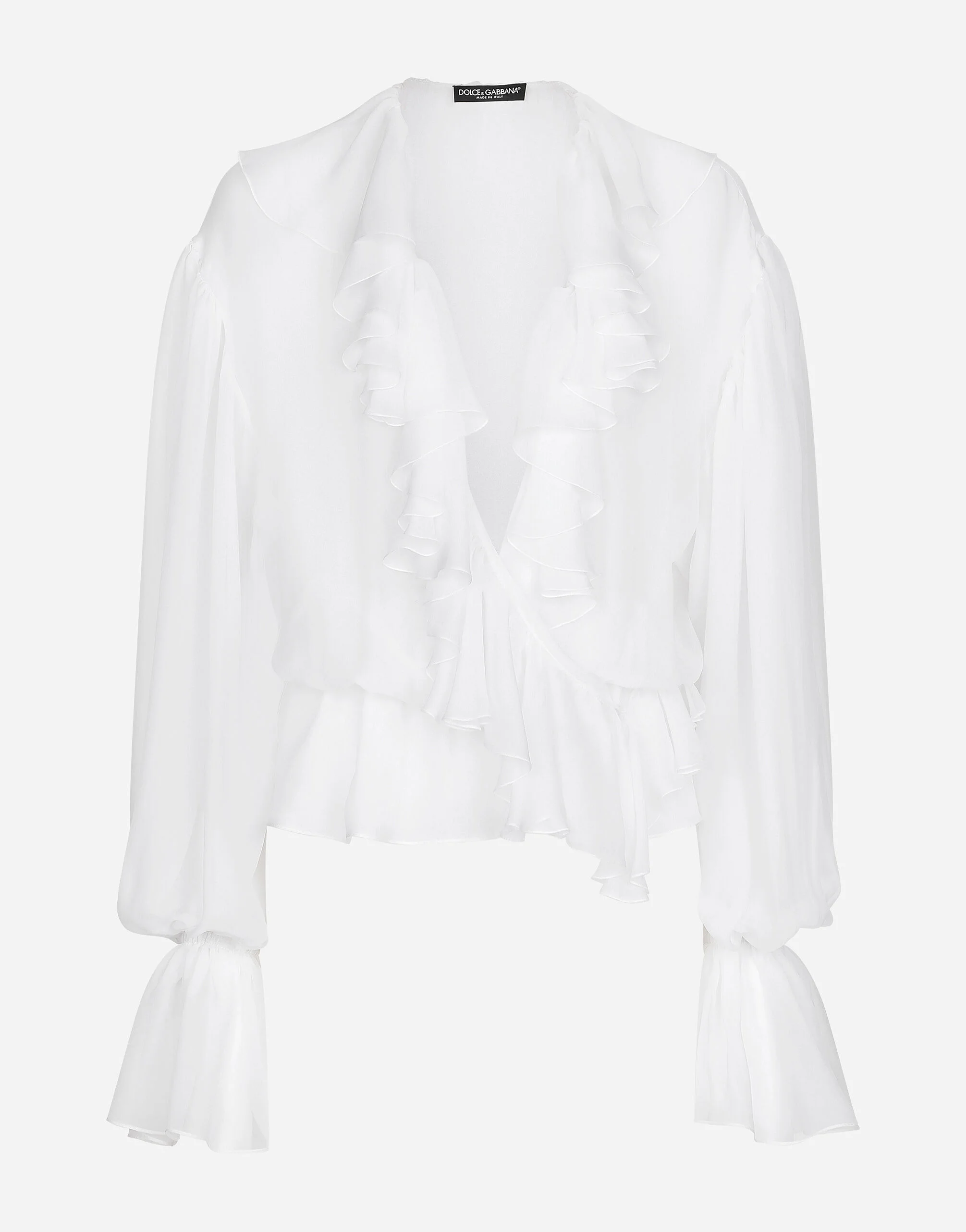 In the “WOMAN SS 24” Collection, the imagery of old Sicily interacts with the masculine, with sensual shapes, lace, nude tones and delicate overlays, to create pieces that move amid clean silhouettes, the elegance of the 1960s, the contrasts of black and white and luxurious textures. The designers are reworking their signature style and their iconic Sicilia black color to convey an aware, seductive and confident Sicilian WOMAN who is imbued with sensuality. Silk chiffon blouse with ruffles: • White • Wrap V-neck • Long sleeves • Loose fit • Stretch cuffs and hem • Unlined • The piece measures 66 cm from the center back on a size IT 40 • The model is 175 cm tall and wears a size IT 40 • Made in Italy External composition: 100% Silk