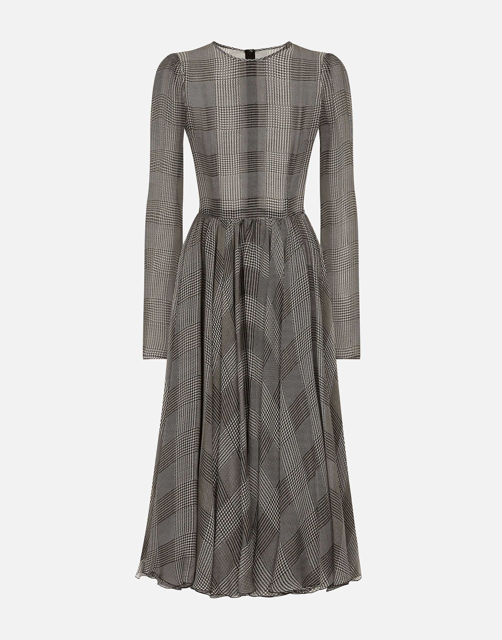 Inspired by 80s fashion photography, the Black Sicily collection masterfully blends masculine and feminine elements, pairing tailored cuts and corset details for the FW 24/25 season. A new vision of the iconic Nero Sicilia black is conveyed through contemporary and sensual looks: jackets and skirts in all-over glen plaid pair with openwork socks, while the 50s-inspired Mun shoes with Eva heel go with the houndstooth Sicily bag featuring crocodile-print leather inserts. Silk chiffon calf-length circle skirt with glen plaid print: • Gray • Round neck • Long sleeves • Stretch silk crepe de chine slip dress • Rear zipper and hook-and-eye fastening • The piece measures 75 cm from the waist down on a size IT 40 • The model is 175 cm tall and wears a size IT 40 • Made in Italy External composition: 100% Silk Internal composition: 91% Silk 9% Spandex