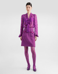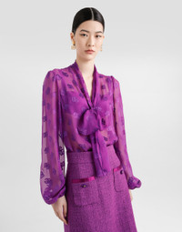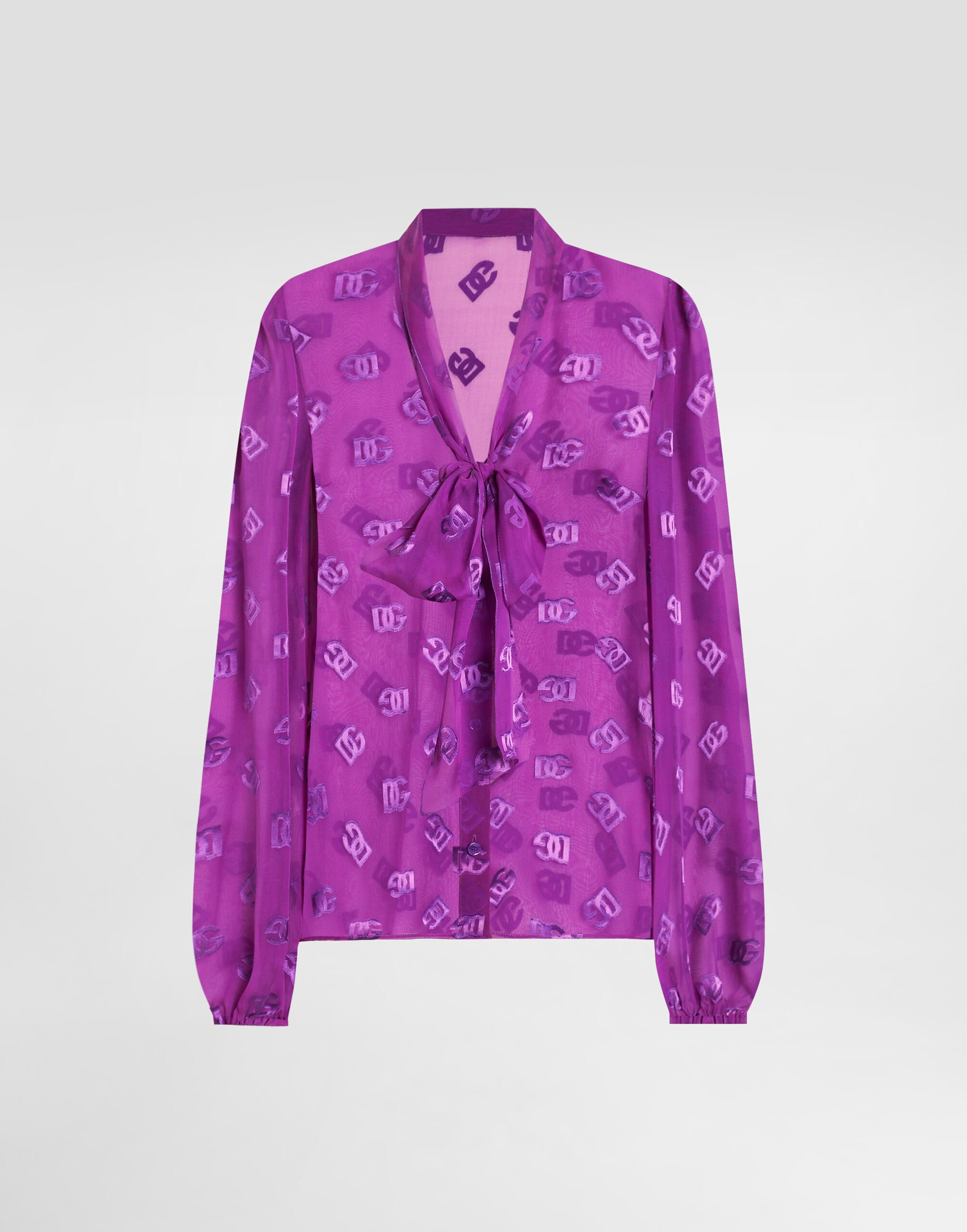 This chiffon shirt is an elegant and sophisticated piece that is perfect for adding a touch of class to your wardrobe. With its V-neck and scarf neck that transforms into a bow on the front, it embodies the essence of contemporary fashion. Jacquard chiffon shirt with DG all-over logo: • Violet • V-neck and scarf collar • Bow on the front • Long sleeves with gathers • Closure with button and poussoir • The model is 175 cm tall and wears size 40 IT • Made in Italy External Composition: 62% Silk, 38% Viscose