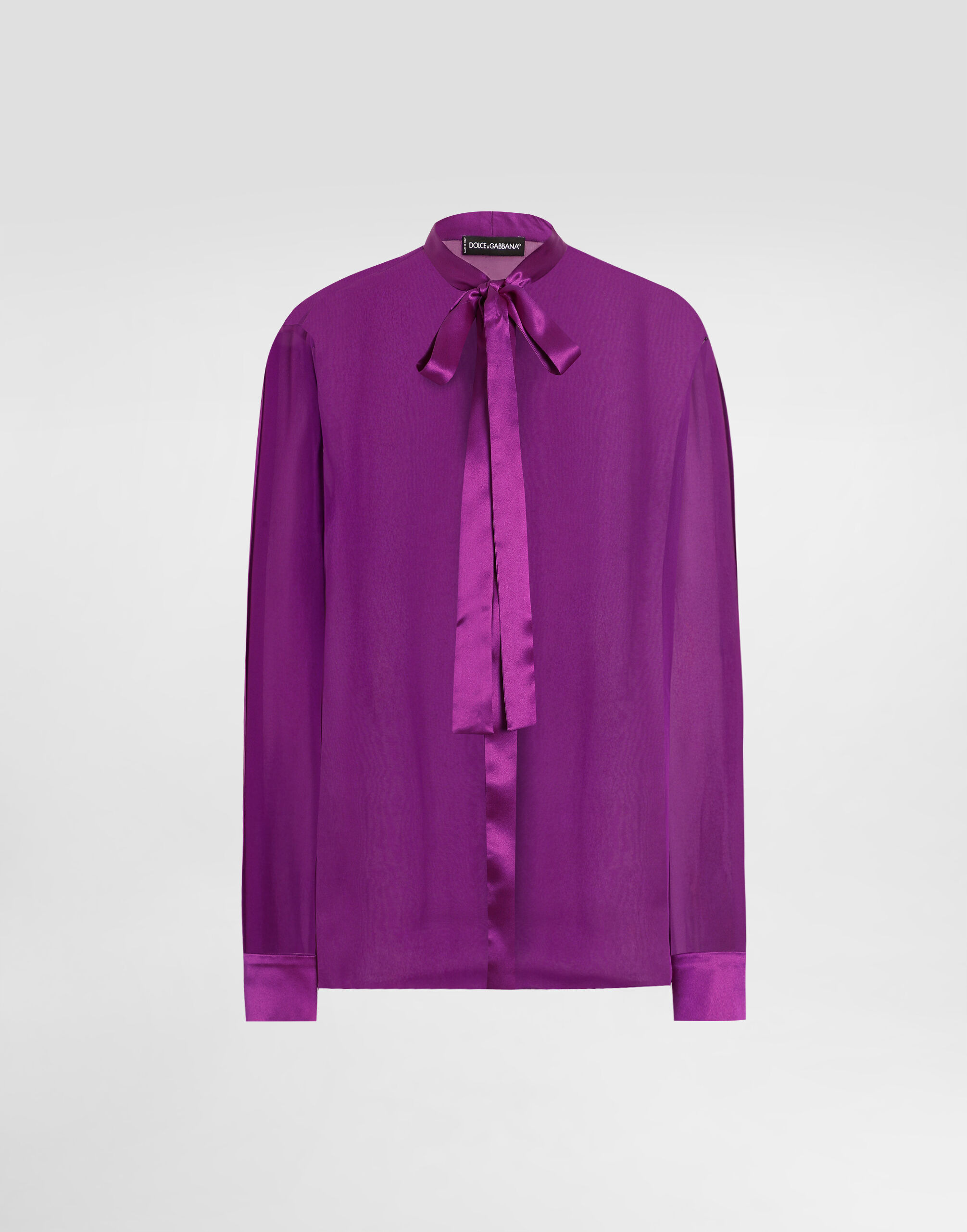 This elegant chiffon shirt is an essential piece to enrich your wardrobe with a touch of class and femininity. Perfect for any occasion, it stands out for its sophisticated design and refined details. Chiffon shirt: • Violet • Gathered front neckline • Scarf collar with bow • Long sleeves • Square cuff with buttonhole and button • The model is 175 cm tall and wears size 40 IT • Made in Italy External Composition: 100% Silk