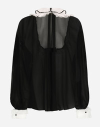 In the “WOMAN SS 24” Collection, the imagery of old Sicily interacts with the masculine, with sensual shapes, lace, nude tones and delicate overlays, to create pieces that move amid clean silhouettes, the elegance of the 1960s, the contrasts of black and white and luxurious textures. The designers are reworking their signature style and their iconic Sicilia black color to convey an aware, seductive and confident Sicilian WOMAN who is imbued with sensuality. Silk chiffon shirt with shirt front and organza cuffs: • Black • Organza neck and cuffs • Long sleeves • Regular fit • Unlined • Button fastenings • The piece measures 65 cm from the center back on a size IT 40 • The model is 175 cm tall and wears a size IT 40 • Made in Italy External composition: 90% Silk 08% Cotton 02% Polyamide