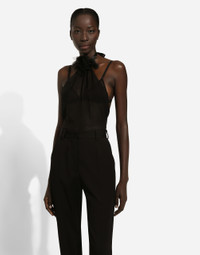 In the “WOMAN SS 24” Collection, the imagery of old Sicily interacts with the masculine, with sensual shapes, lace, nude tones and delicate overlays, to create pieces that move amid clean silhouettes, the elegance of the 1960s, the contrasts of black and white and luxurious textures. The designers are reworking their signature style and their iconic Sicilia black color to convey an aware, seductive and confident Sicilian WOMAN who is imbued with sensuality. Silk chiffon top with flower on neck: • Black • Halterneck that ties to the back • Sleeveless • Unlined • Tie at the back • The model is 175 cm tall and wears a size IT 40 • Made in Italy External composition: 90% Silk 10% Polyester
