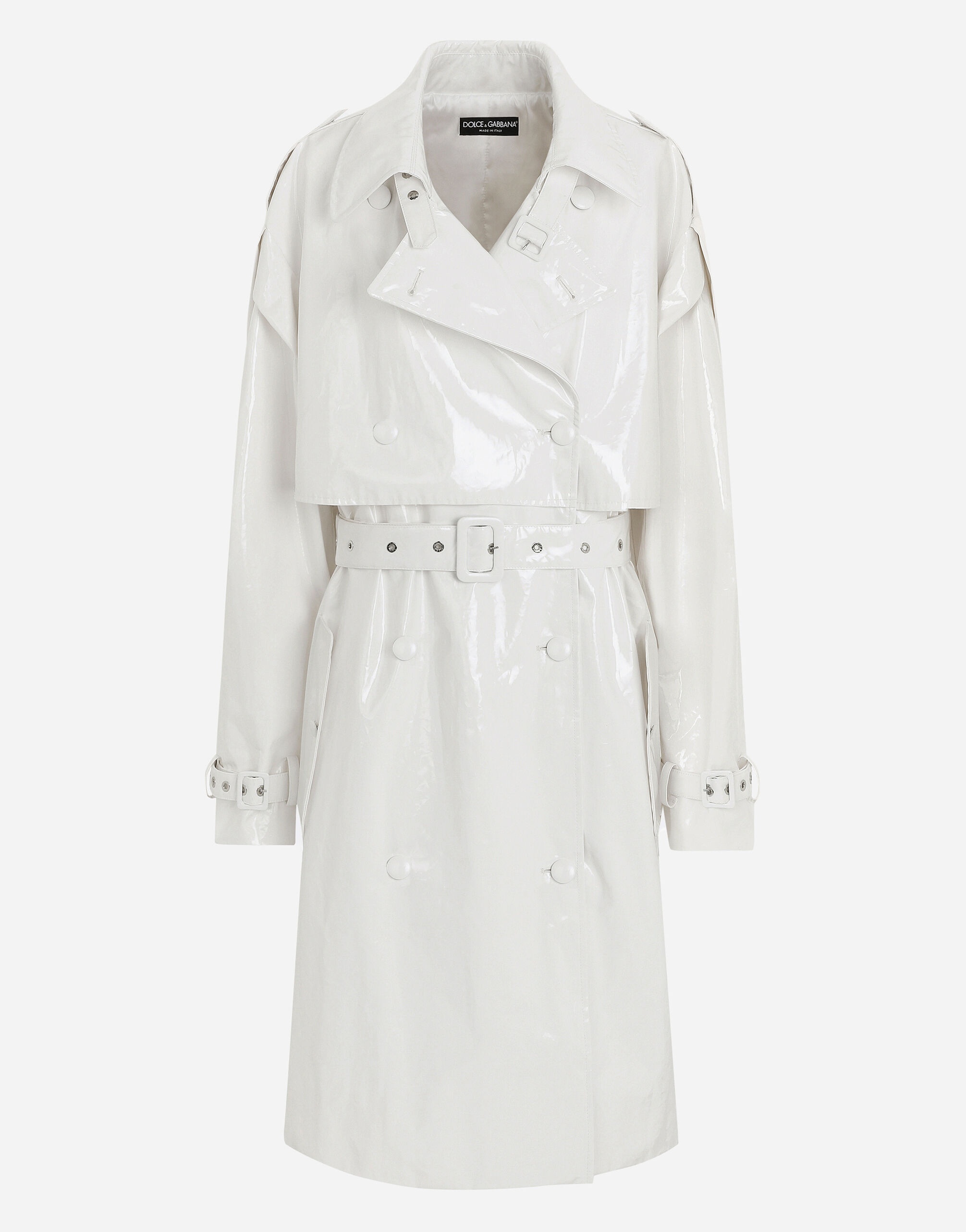 In the “WOMAN SS 24” Collection, the imagery of old Sicily interacts with the masculine, with sensual shapes, lace, nude tones and delicate overlays, to create pieces that move amid clean silhouettes, the elegance of the 1960s, the contrasts of black and white and luxurious textures. The designers are reworking their signature style and their iconic Sicilia black color to convey an aware, seductive and confident Sicilian WOMAN who is imbued with sensuality. Coated cotton trench coat: • White • Notched lapels • Long sleeves • Regular fit • Satin lining • Button fastenings and belt • The piece measures 115 cm from the center back on a size IT 40 • The model is 175 cm tall and wears a size IT 40 • Made in Italy External composition: 100% Cotton Internal composition: 100% Polyamide