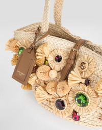 The Coffa Capri bag, a tribute to Mediterranean craftsmanship, is perfect for those who love the boho-chic style. Made with precious materials, it is enriched with embroidered details that make it unique. Coffa Capri bag: • Multi-coloured • Corn handles, removable and adjustable leather shoulder strap • Magnet closure in vintage brass buckle • External and internal customization with stamp and film • Embellished with pom poms, rosettes and bezels • Internal zipped pocket • Item equipped with a logo bag and pre-assembled box • Measurements: H24 x W46 x D18 cm • Made in Italy External Composition: 85% Corn fiber, 10% Calfskin, 5% PVC