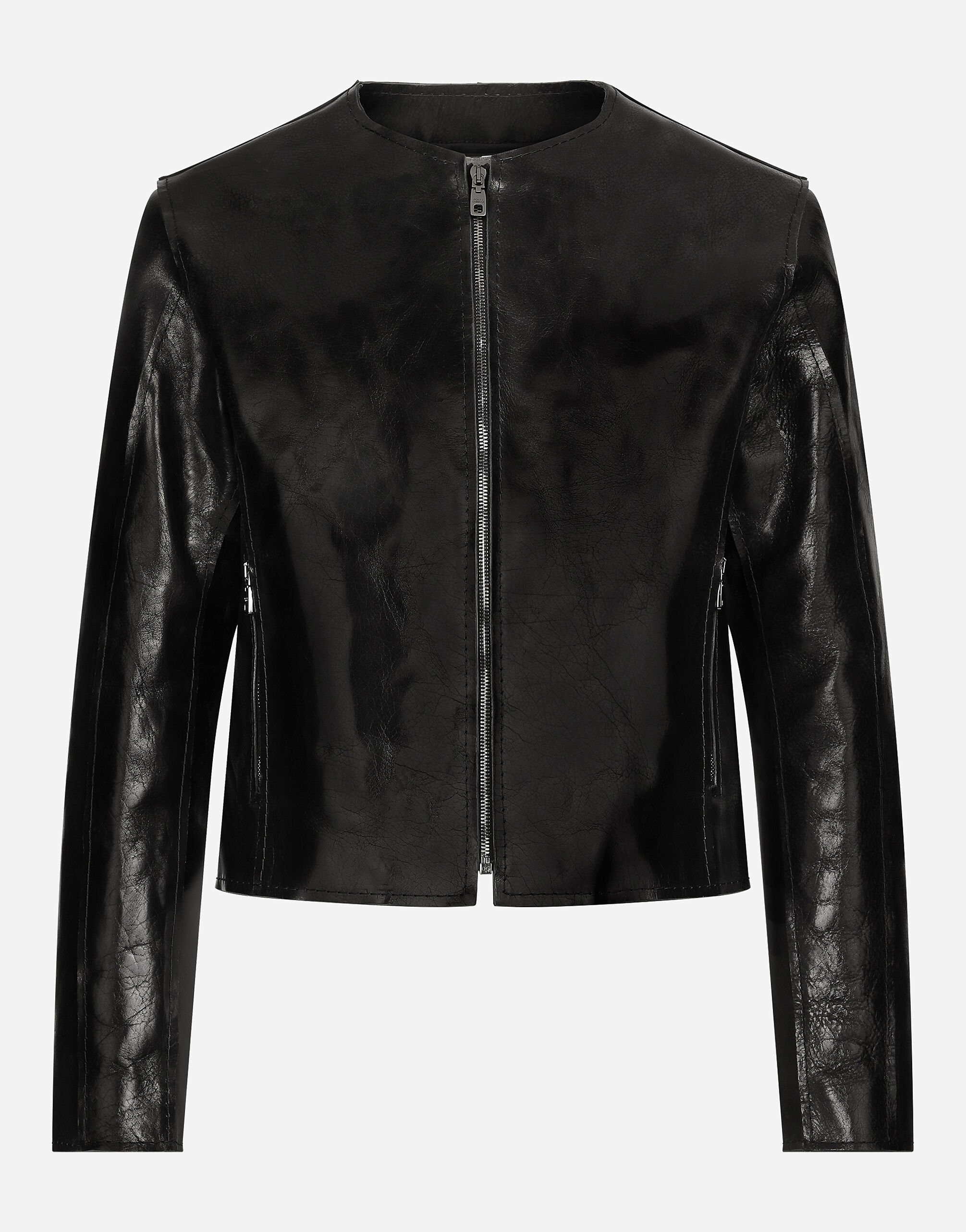 Contemporary men’s formalwear: The FW 24/25 Dolce&Gabbana Men’s Collection is embracing the concept of absolute elegance dominated by the iconic Nero Sicilia black. The daywear of the Dolce&Gabbana man comes to life through the outerwear that comes in a range of lengths and the slim-fit pants. For nightwear, the look becomes scintillating thanks to sequined embellishment and stone appliques. This refined taste can also be seen on the accessories, such as on the slip-ons with hand-applied organza flower accent and the new clutch. Collarless calfskin jacket with a raw cut: • Black • Regular fit • Front zipper fastening • Outer patch pockets with exposed zippers and inner welt pockets • Lined • The piece measures 60 cm from the rear collar seam on a size IT 48 • Made in Italy External composition: 50% Calfskin 45% Polyester 5% Spandex Internal Composition: 100% Viscose