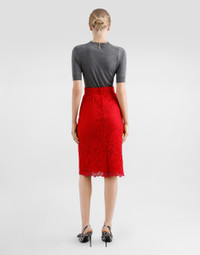 The Everyday Women's Collection reimagines contemporary daily wear with Dolce&Gabbana's signature style codes. Iconic fabrics mix with standout details like embroidered flowers, crystals, and jewel buttons, infusing elegance into every look. Gray animal print accented with green and purple, hyper-geometric jewelry, voluminous shapes and transparencies add unique touches. Men's tweed is reinvented with graphic twists, creating distinctive pieces that reflect refined sensuality. Floral cordonetto lace midi pencil skirt: • Red • High-waisted • Stretch silk crepe de chine underskirt • Rear zipper and hook-and-bar fastening • The piece measures 65 cm from the waist down on a size IT 40 • The model is 175 cm tall and wears a size IT 40 • Made in Italy External composition: 53% Cotton 37% Viscose 10% Polyamide Internal composition: 91% Silk 09% Spandex