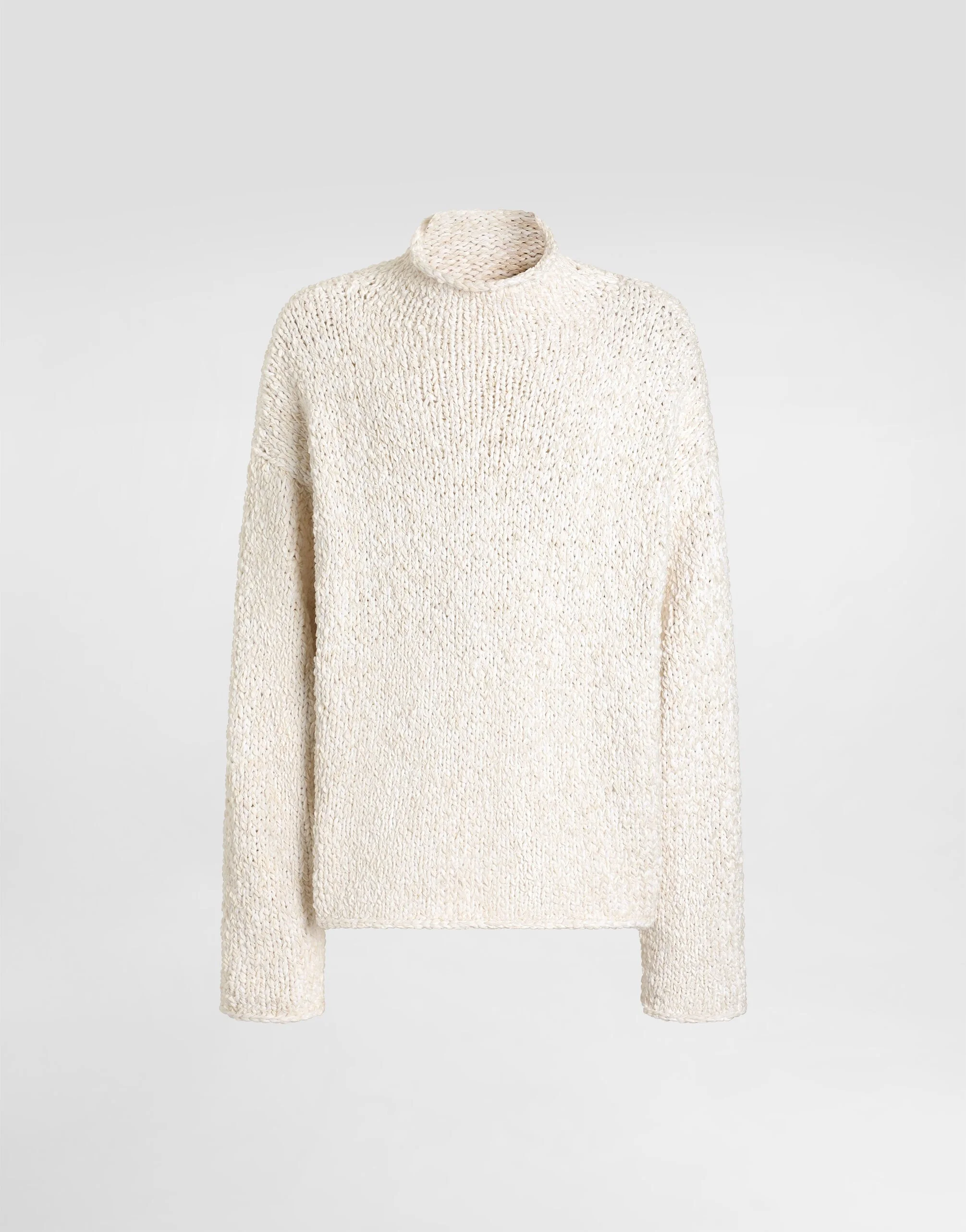 Lightness, Italian aesthetics, and effortless style define the Dolce&Gabbana Men's Spring/Summer 2026 Collection. Pyjamas take center stage, blurring lines between indoor and outdoor spaces with unexpected pairings. Made of striped jacquard cotton, they pair with cardigans, jackets, and sparkling decorations. Relaxed silhouettes, neutral tones with bold contrast details, and iconic accessories complete versatile looks. This funnel neck pullover is ideal for those looking for comfort and style in one piece. Perfect for cooler days, it adapts elegantly to different occasions. Cotton-blend pullover: • White • Funnel neck • Long sleeves • The model is 185 cm tall and wears a size 48 IT • Made in Italy External composition: 72% Cotton, 18% Polyamide, 10% Jute