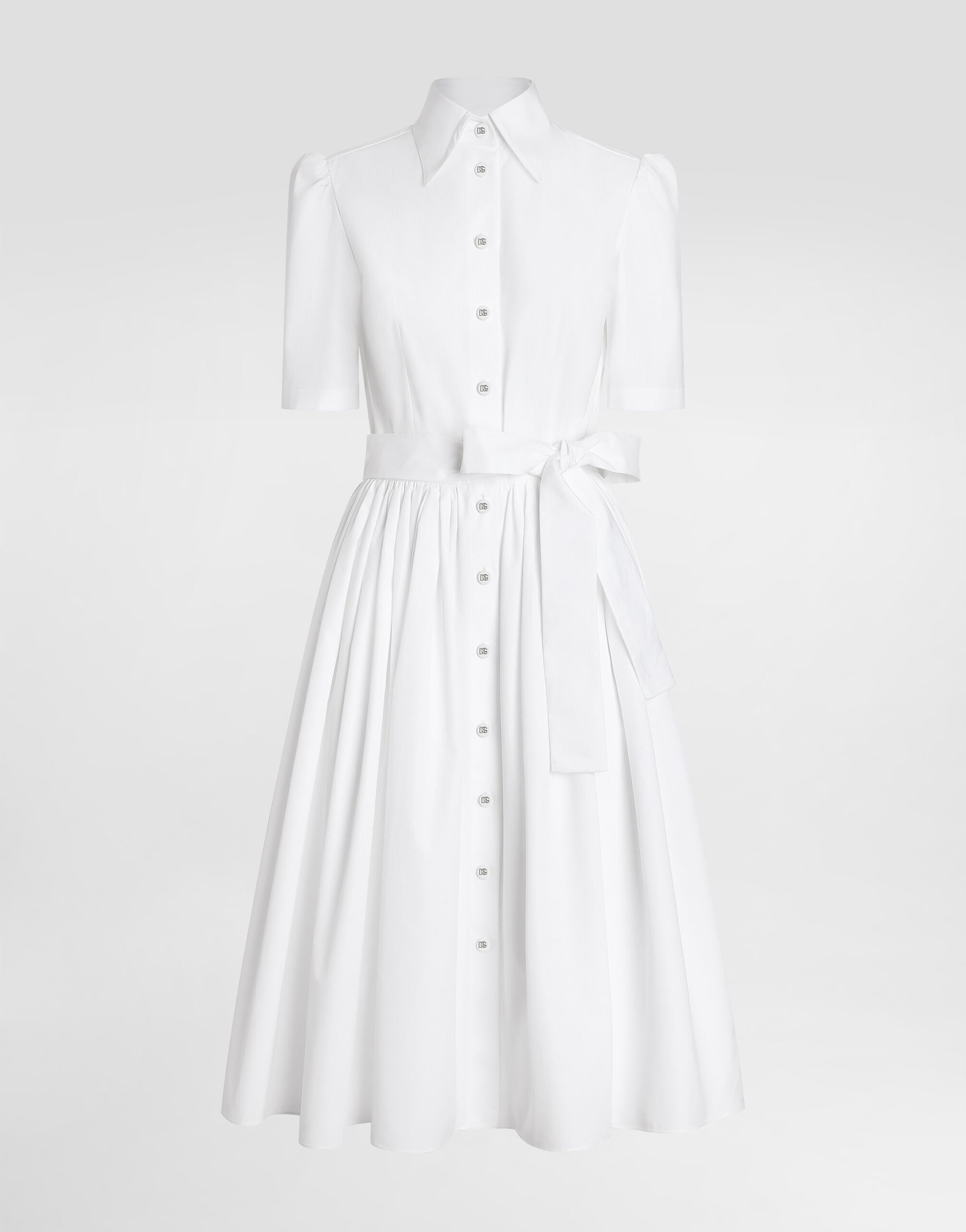 The Spring/Summer 2025 Warm Weather Collection is a vibrant ode to the beauty of the floral world, celebrating the elegance and vitality that lie at the heart of the brand’s DNA. Delicate, colorful bouquets dance across light dresses, skirts, trousers, and beachwear, infusing each piece with a sense of romance and freshness. Coordinated accessories, from scarves to headbands, add charm. An explosion of color and blooms, this collection captures the brand’s unmistakable spirit. Cotton poplin calf-length shirt dress: • White • Shirt collar • Short sleeves • Belted waist • Unlined • DG branded buttons on the front • The piece measures 110 cm from the center back on a size IT 40 • The model is 175 cm tall and wears a size IT 40 • Made in Italy External composition: 100% Cotton