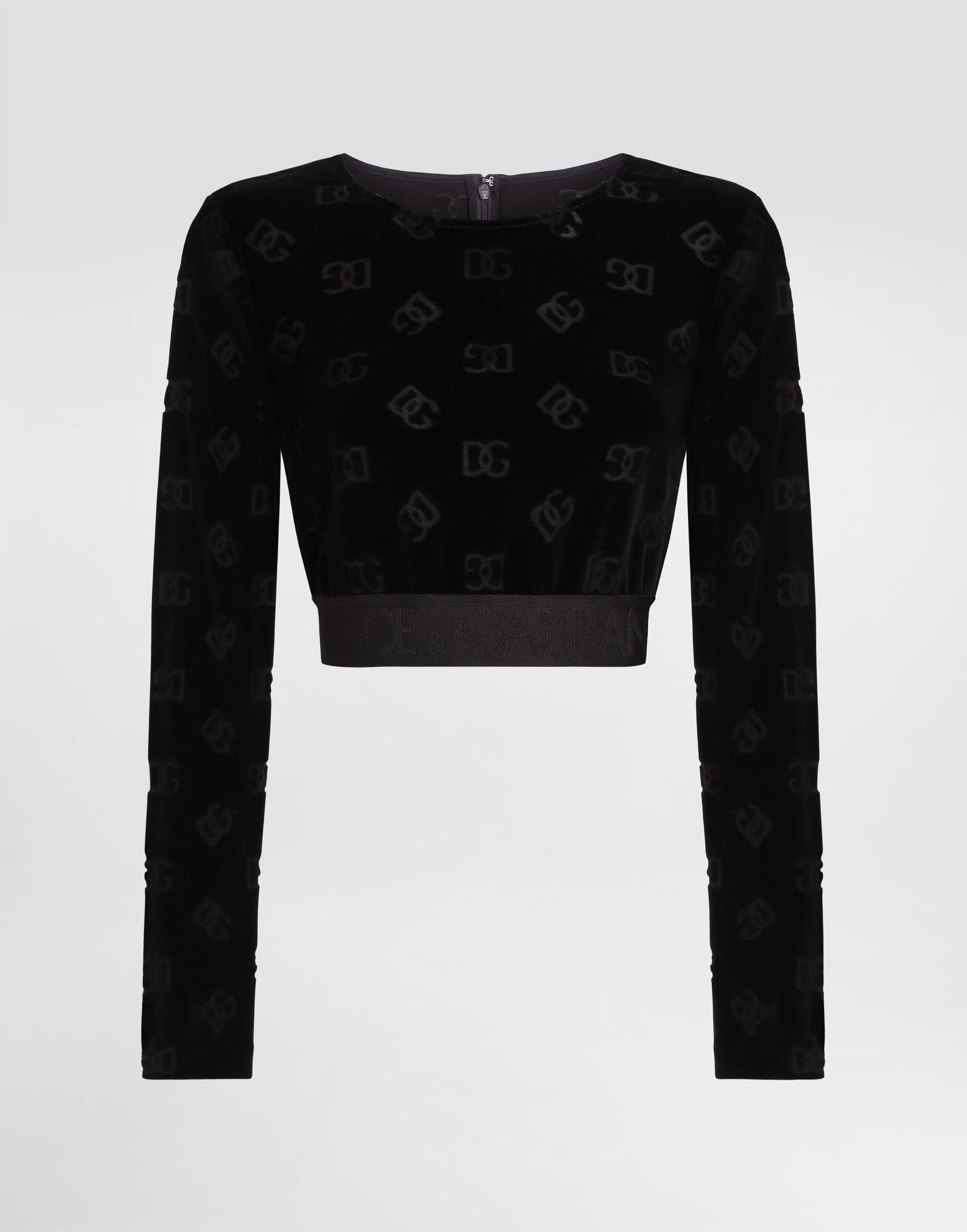 The Women’s DNA Collection is introducing a new side to femininity, which comes in shades of rose quartz, poised between sheerness and opacity, lightness and structure, formality and sensuality. Geometric Dolce Jackets, jacquard pajamas and floral brocade dresses intertwine with ultra-romantic designs. The DG print becomes an iconic statement, while Cordonetto lace and hints of Sicily Black embody the essence of a determined yet romantic femininity. Cotton chenille crop top with jacquard DG logo: • Black • Round neckline • Long sleeves • Branded elasticated hem • Cropped fit • The piece measures 36 cm from the center back on a size IT 40 • The model is 175 cm tall and wears a size IT 40 • Made in Italy External composition: 100% Cotton