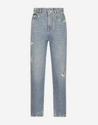 Dolce&Gabbana is conveying a new way of interpreting denim and does so by drawing inspiration from key words such as glamor and signature aesthetic, creating a collection that is perfect for every style and personality, merging femininity, modernity and originality. Stonewash cotton denim Amber jeans with rips: • Blue • High-waisted • 5 pockets • Branded label on the coin pocket • Branded metal and leather tag on the back pocket • Leg length from waistband: 107 cm • Hem: 15 cm • Zipper and branded metal button fastening • The model is 175 cm tall and wears a size IT 40 • Made in Italy External composition: 100% Cotton