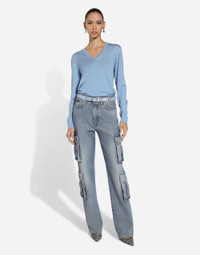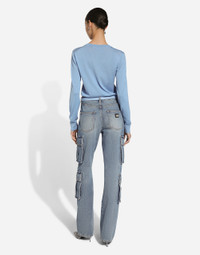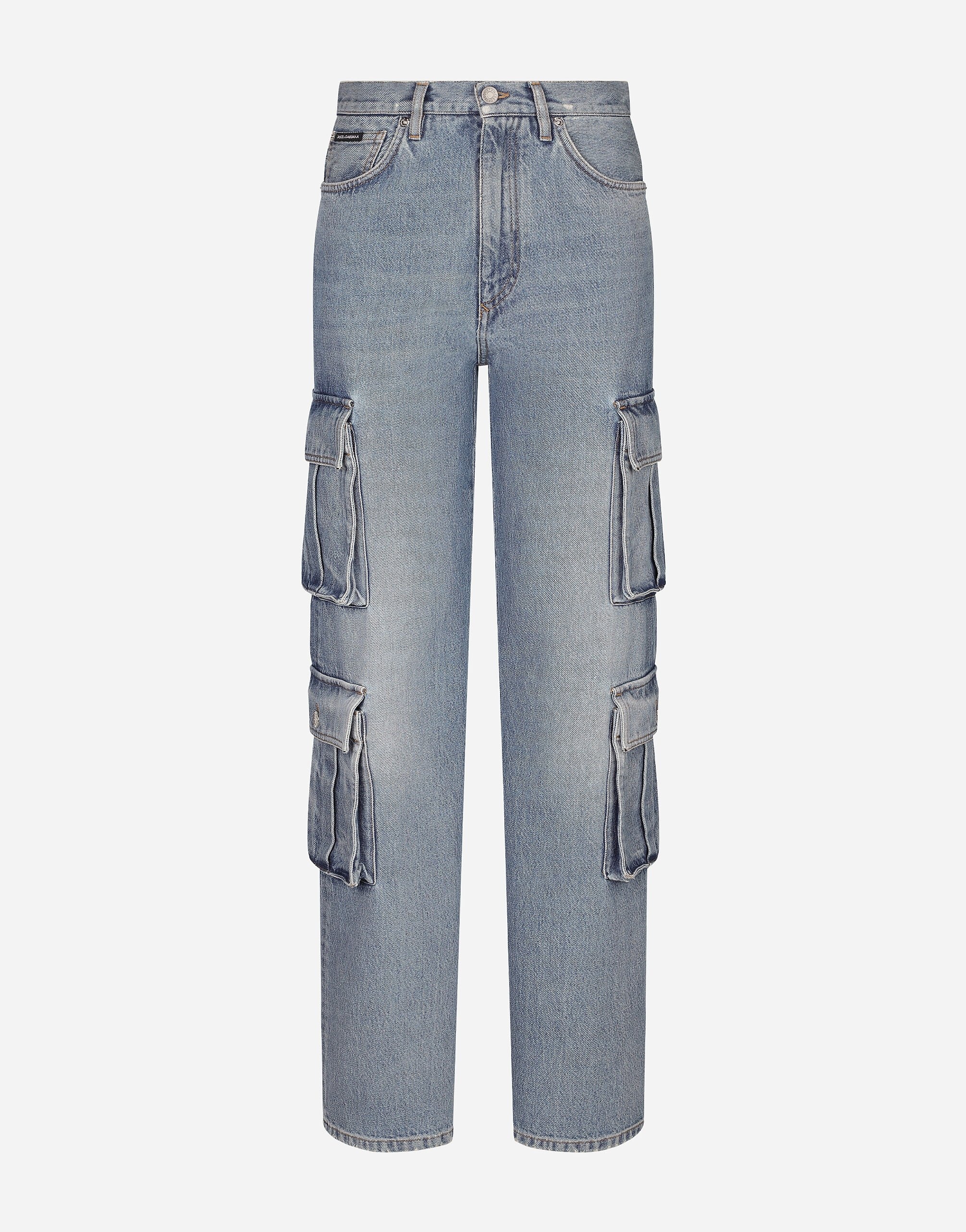 Dolce&Gabbana is conveying a new way of interpreting denim and does so by drawing inspiration from key words such as glamor and signature aesthetic, creating a collection that is perfect for every style and personality, merging femininity, modernity and originality. Vintage-look stonewash cotton denim cargo jeans: • Blue • Regular rise • Multiple pockets • Branded label on the coin pocket • Tobacco brown top-stitching • Branded metal and leather tag on the back pocket • Leg length from waistband: 107 cm • Hem: 23 cm • Zipper and branded metal button fastening • The model is 175 cm tall and wears a size IT 40 • Made in Italy External composition: 100% Cotton