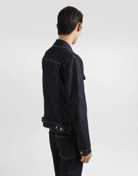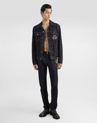 The Italian Holiday Men's Collection revisits 1950s style with a blend of relaxed fits and modern flair. Classic white shirts and tailored suits in refined fabrics contrast with casual denim and playful T-shirts featuring retro graphics with a futuristic twist. Bold prints—chessboards, cats, elegant lighters, and Mediterranean blue ribbons—alongside logo jacquard inspired by ties, infuse a contemporary edge into the essence of Italian holidays. Cotton denim jacket with heraldic emblem: • Blue • Slim fit • Branded metal buttons on the front • Pockets with buttons and Dolce&Gabbana logo label • The piece measures 60 cm from the rear collar seam on a size IT 48 • Made in Italy External composition: 98% Cotton 2% Spandex
