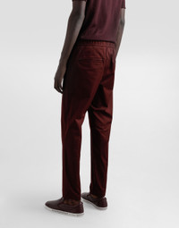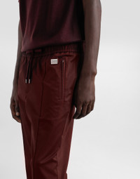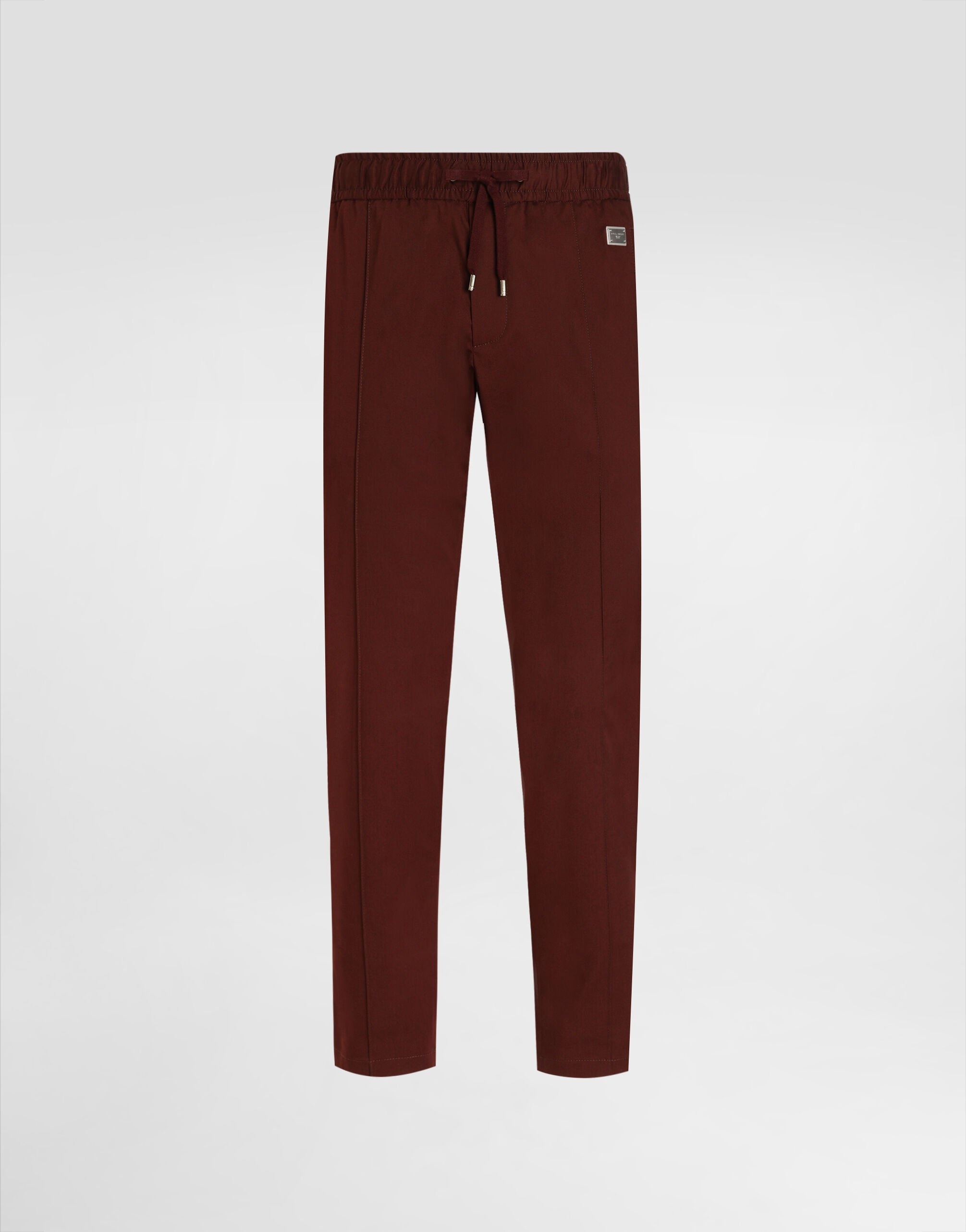 The DNA Men's Collection reimagines daily wear with bold contrasts, meticulous details, and innovative silhouettes. Outerwear stands out with clean lines and high-tech materials, merging sportiness with sophistication in sweaters, sweatshirts, and trousers. A striking color palette, including Black Sicily, caramel, cream, burgundy, and stone gray, pairs with iconic prints like Leopard and Polka dots, enhancing the collection's authentic and refined look. Cotton gabardine jogging pants with a metal tag and the Dolce&Gabbana logo: • Burgundy • Regular fit • Stretch waistband with drawstring • Front welt pockets with zipper and zipped welt pockets at the back • The item measures 99 cm on the outer leg and the hem is 18 cm wide on a size IT 48 • Made in Italy External composition: 98% Cotton 2% Spandex