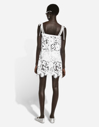 The Italian summers of the 1960s, the candid purity of white, the sophisticated elegance of the jet set of that era. The imagery of the FW24/25 Capri Collection encapsulates all this flawlessly. The pieces range from floaty poplin silhouettes or sack-style dresses and skirts, to brocade outerwear and floral-inlay fabric shirts. The iconic bags – the Logo Bag, the Sicily Bag and the Dolce Box – complement the looks, while the shoes come embroidered with designs inspired by the crystal-clear sea of Capri. Cotton minidress with floral openwork embroidery: • White • Straight neckline • Sleeveless with tie-detailed shoulder straps • Unlined • Rear zipper and hook-and-eye fastening • The piece measures 45 cm from the waist down on a size IT 40 • The model is 175 cm tall and wears a size IT 40 • Made in Italy External composition: 51% Cotton 49% Polyester