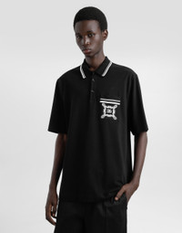The DNA Men's Collection reimagines daily wear with bold contrasts, meticulous details, and innovative silhouettes. Outerwear stands out with clean lines and high-tech materials, merging sportiness with sophistication in sweaters, sweatshirts, and trousers. A striking color palette, including Black Sicily, caramel, cream, burgundy, and stone gray, pairs with iconic prints like Leopard and Polka dots, enhancing the collection's authentic and refined look. Cotton pique polo-shirt with bandanna-print details • Black • Regular fit • Button fastenings • Short sleeves • The piece measures 73.5 cm from the shoulder seam on a size IT 48 • Made in Italy The difference in the print placement that you may find on this product is a feature of Dolce&Gabbana’s “Handmade” pieces. A detail that makes every garment or accessory unique and exclusive. External composition: 100% Cotton