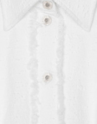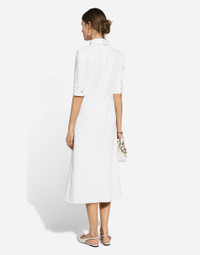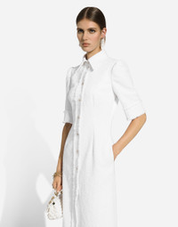 The Italian summers of the 1960s, the candid purity of white, the sophisticated elegance of the jet set of that era. The imagery of the FW24/25 Capri Collection encapsulates all this flawlessly. The pieces range from floaty poplin silhouettes or sack-style dresses and skirts, to brocade outerwear and floral-inlay fabric shirts. The iconic bags – the Logo Bag, the Sicily Bag and the Dolce Box – complement the looks, while the shoes come embroidered with designs inspired by the crystal-clear sea of Capri. A-line cotton raschel tweed calf-length dress: • White • Shirt collar • Mother-of-pearl-effect decorative buttons • 3/4 puff sleeves • Stretch silk satin lining • Rear zipper and hook-and-eye fastening • The piece measures 105 cm from the center back on a size IT 40 • The model is 175 cm tall and wears a size IT 40 • Made in Italy External composition: 80% Cotton 15% Linen 05% Polyamide Internal composition: 92% Silk 08% Spandex