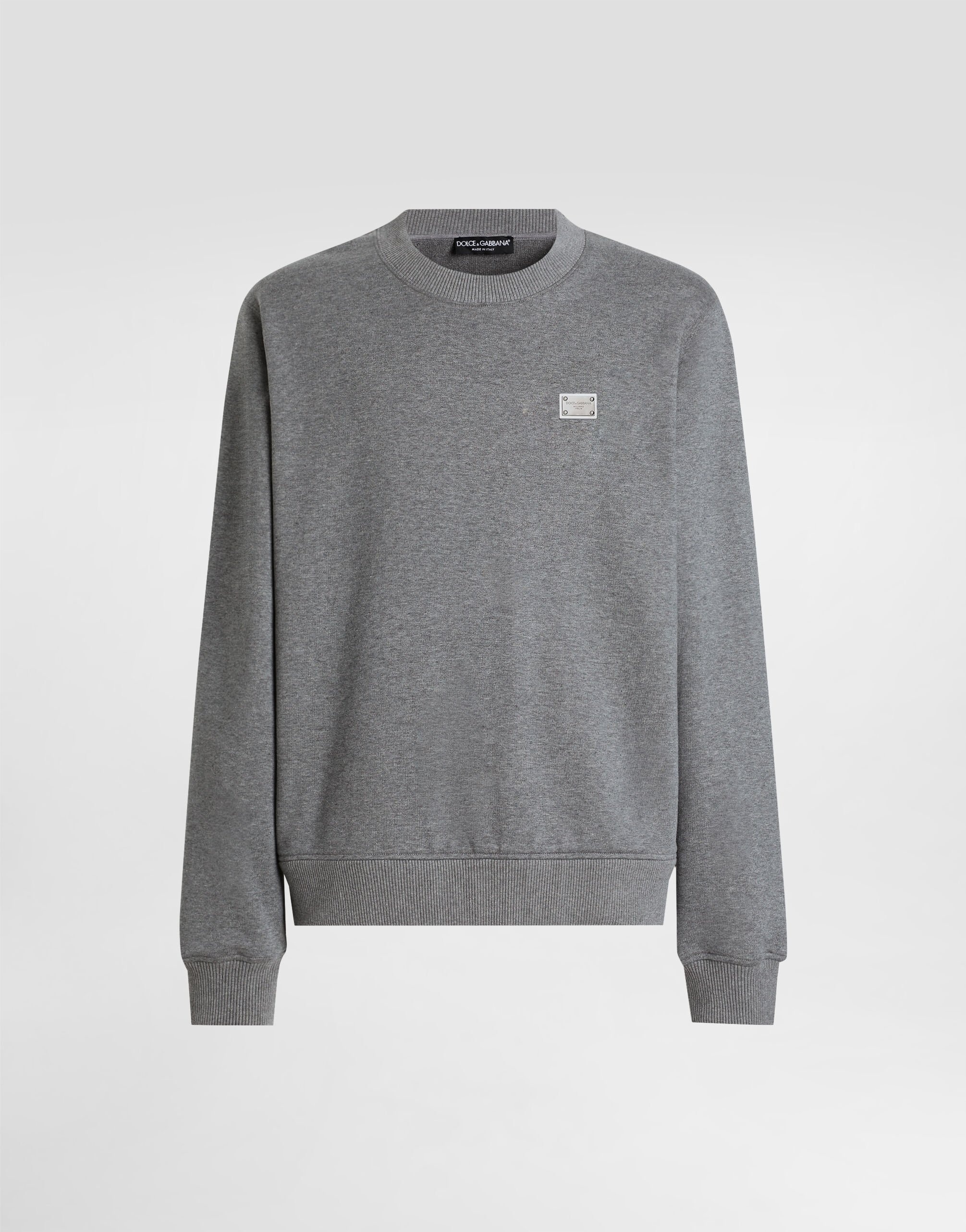 The DNA Men's Collection reimagines daily wear with bold contrasts, meticulous details, and innovative silhouettes. Outerwear stands out with clean lines and high-tech materials, merging sportiness with sophistication in sweaters, sweatshirts, and trousers. A striking color palette, including Black Sicily, caramel, cream, burgundy, and stone gray, pairs with iconic prints like Leopard and Polka dots, enhancing the collection's authentic and refined look. Cotton jersey sweatshirt with metal branded tag: • Gray • Classic fit • Fine-rib neck, sleeves and hem • Long sleeves • Metal Dolce&Gabbana branded tag • The piece measures 68 cm from the shoulder seam on a size IT 48 • Made in Italy External composition: 100% Cotton