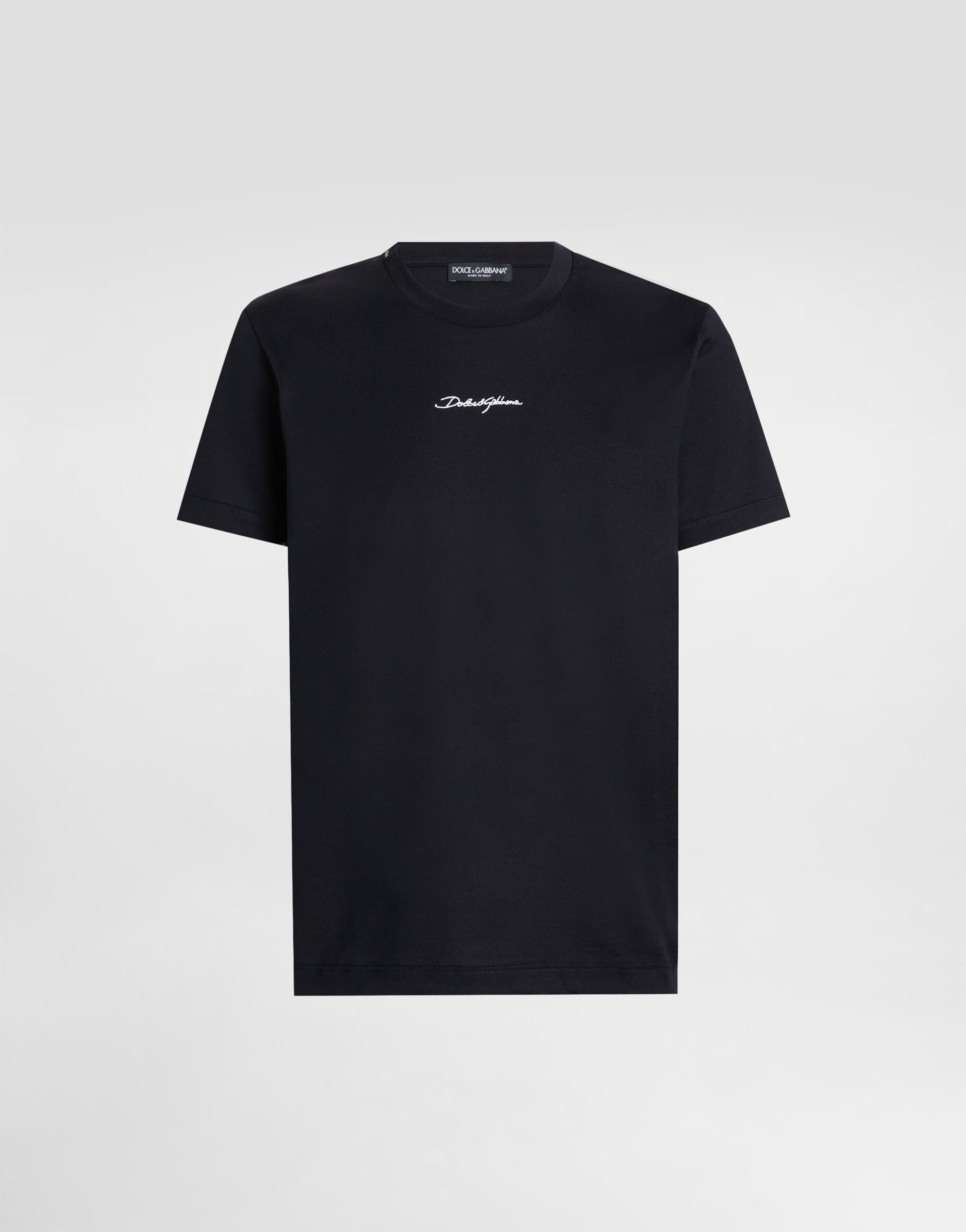 The Italian Holiday Men's Collection revisits 1950s style with a blend of relaxed fits and modern flair. Classic white shirts and tailored suits in refined fabrics contrast with casual denim and playful T-shirts featuring retro graphics with a futuristic twist. Bold prints—chessboards, cats, elegant lighters, and Mediterranean blue ribbons—alongside logo jacquard inspired by ties, infuse a contemporary edge into the essence of Italian holidays. Cotton jersey T-shirt with Dolce&Gabbana embroidered patch: • Blue • Classic fit • Knit neck, sleeves and hem • Short sleeves • The piece measures 71.5 cm from the shoulder seam on a size IT 48 • Made in Italy External composition: 100% Cotton