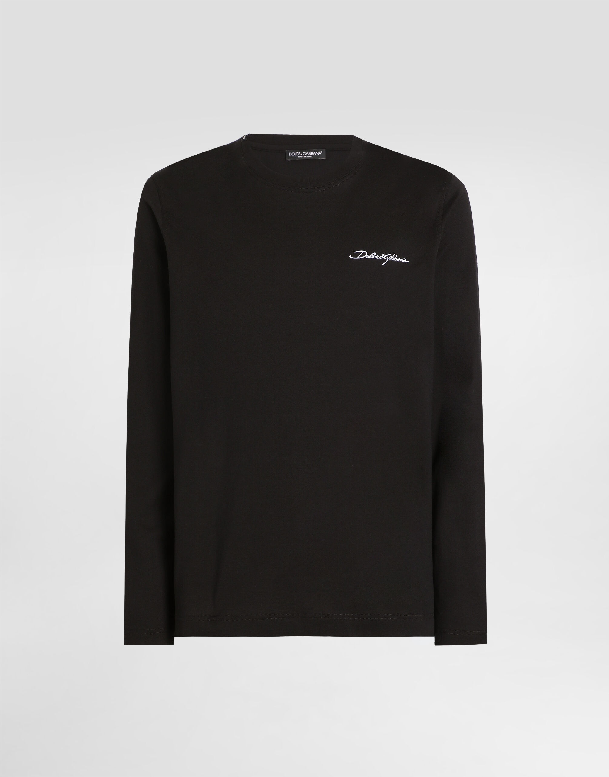 This long-sleeved t-shirt is a must-have in the men's wardrobe, with refined details that enhance a classic and timeless style. Cotton t-shirt with embroidery: • Black • Long sleeves • With embroidery on the front • The model is 185 cm tall and wears a size 48 IT • Made in Italy External Composition: 100% Cotton