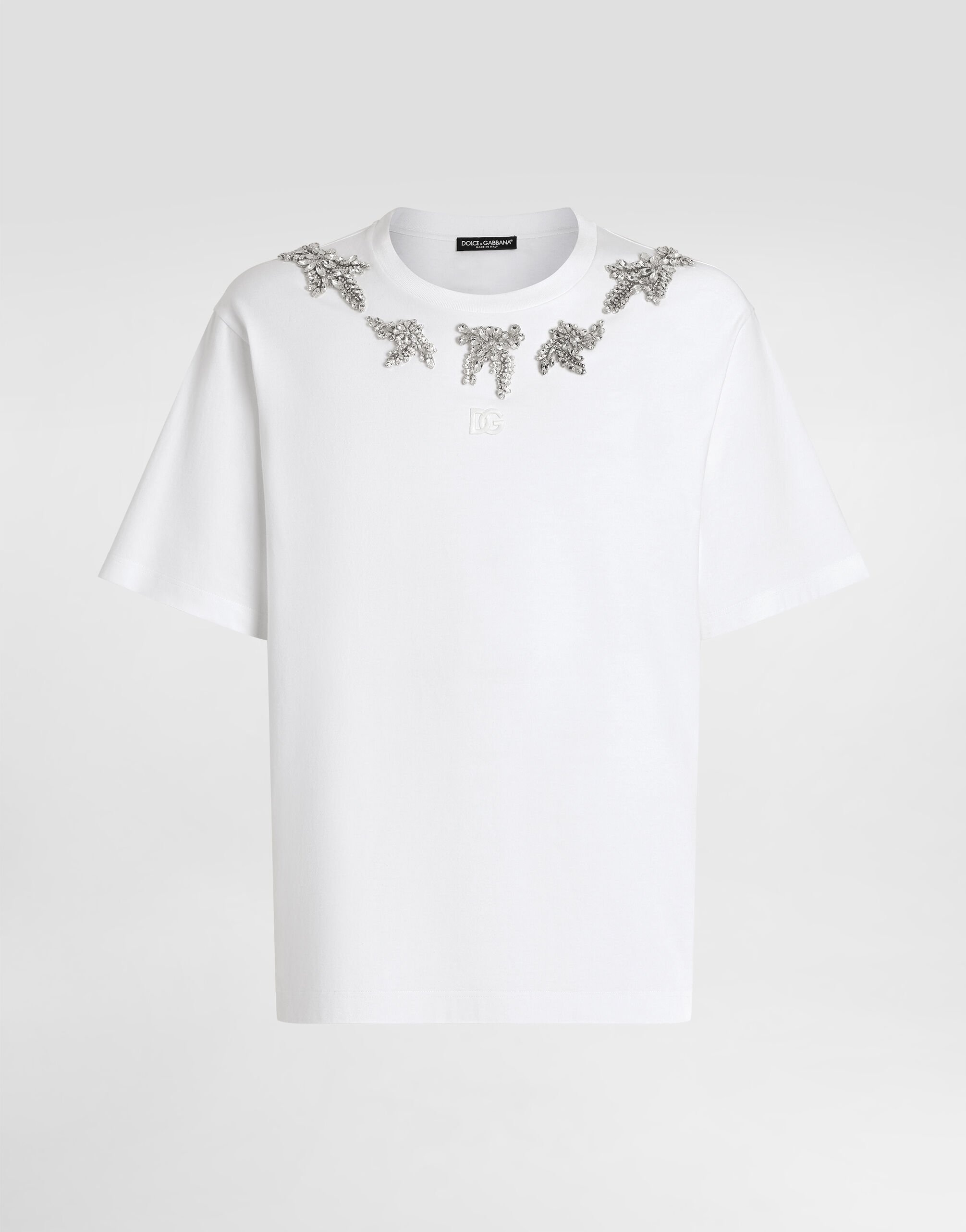 This white t-shirt with embroidery details and brooch brings a touch of elegance to your casual clothing collection. Perfect for an everyday look that does not compromise on style. Short-sleeved cotton t-shirt with embroidery and brooch: • White • Regular fit • Bottom width 74 cm on size 48 IT • The model is 185 cm tall and wears a size 48 IT • Made in Italy External Composition: 100% Cotton