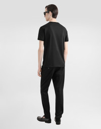 The Italian Holiday Men's Collection revisits 1950s style with a blend of relaxed fits and modern flair. Classic white shirts and tailored suits in refined fabrics contrast with casual denim and playful T-shirts featuring retro graphics with a futuristic twist. Bold prints—chessboards, cats, elegant lighters, and Mediterranean blue ribbons—alongside logo jacquard inspired by ties, infuse a contemporary edge into the essence of Italian holidays. Cotton jersey T-shirt with heraldic emblem patch: • Black • Classic fit • Branded stick label on the neck • Knit neck, sleeves and hem • Short sleeves • The piece measures 72 cm from the shoulder seam on a size IT 48 • Made in Italy External composition: 100% Cotton