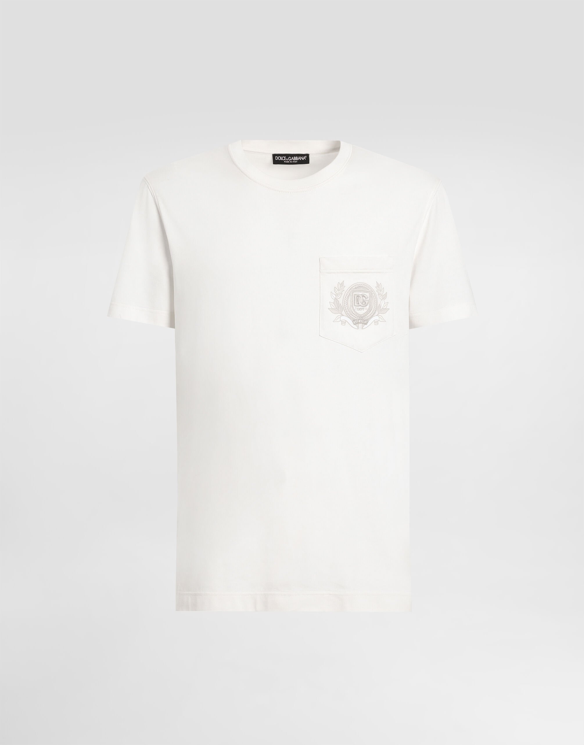 The DNA Men's Collection reimagines daily wear with bold contrasts, meticulous details, and innovative silhouettes. Outerwear stands out with clean lines and high-tech materials, merging sportiness with sophistication in sweaters, sweatshirts, and trousers. A striking color palette, including Black Sicily, caramel, cream, burgundy, and stone gray, pairs with iconic prints like Leopard and Polka dots, enhancing the collection's authentic and refined look. Cotton jersey T-shirt with DG logo embroidery: • Cream • Classic fit • Knit neck, sleeves and hem • Short sleeves • The piece measures 71.5 cm from the shoulder seam on a size IT 48 • Made in Italy External composition: 100% Cotton