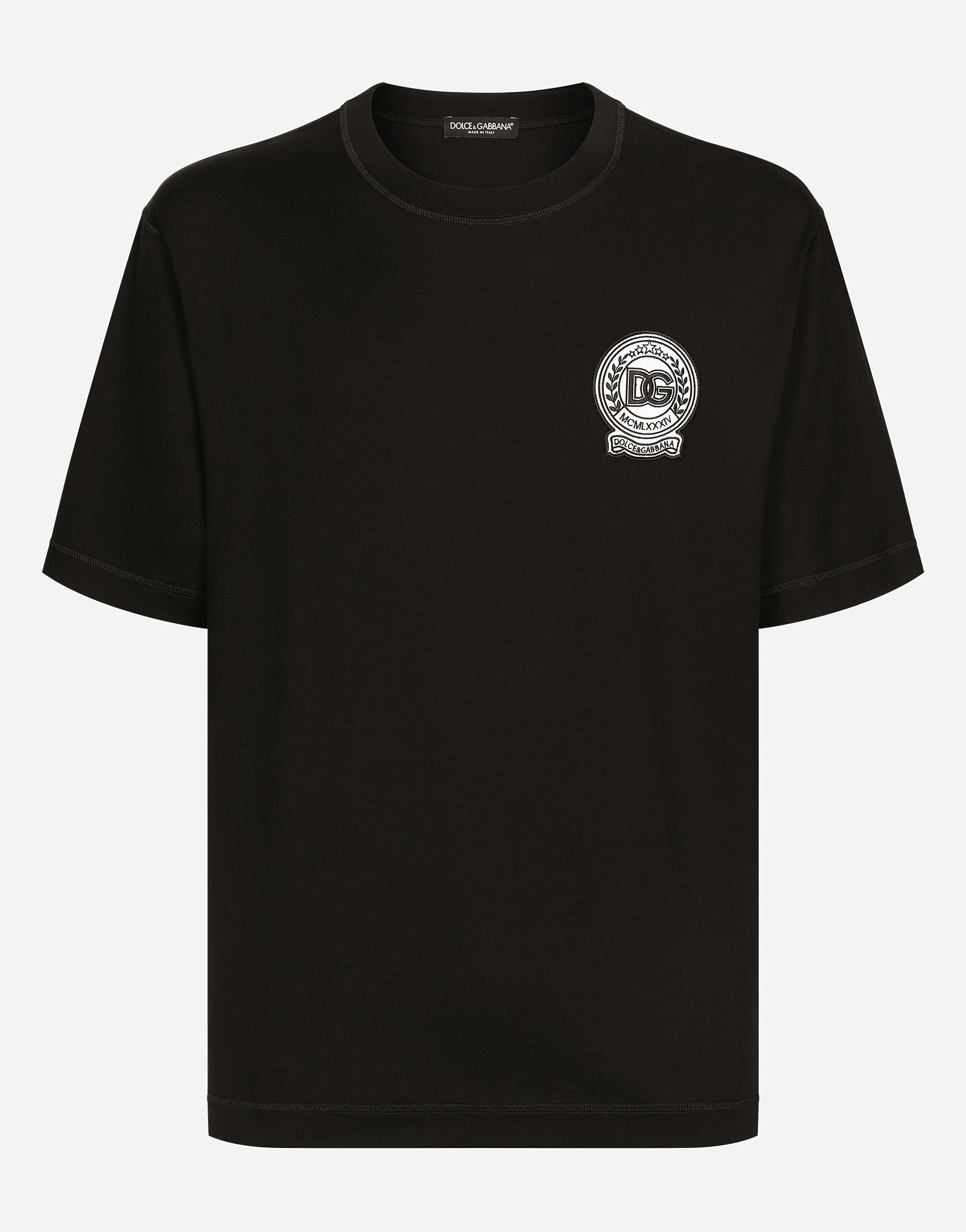 The Palermo collection represents the link between the Sicilian man’s world and the unspoiled nature of the island. A language marked by warm hues - sand, cream, Nero Sicilia black - floral paintings and iconic prints.The Dolce&Gabbana closet must-haves have been reworked in different materials, in pursuit of a new form of harmony. A collection rich in suggestion, such as the stripes inspired by the old mattresses of the 1940s and 1950s, and the timeless aesthetic of the looks. Cotton jersey T-shirt with raised Dolce&Gabbana logo embroidery: • Black • Regular fit • Stretch knit round neck • Short sleeves • The piece measures 73 cm from the rear collar seam on a size IT 48 • Made in Italy External composition: 100% Cotton