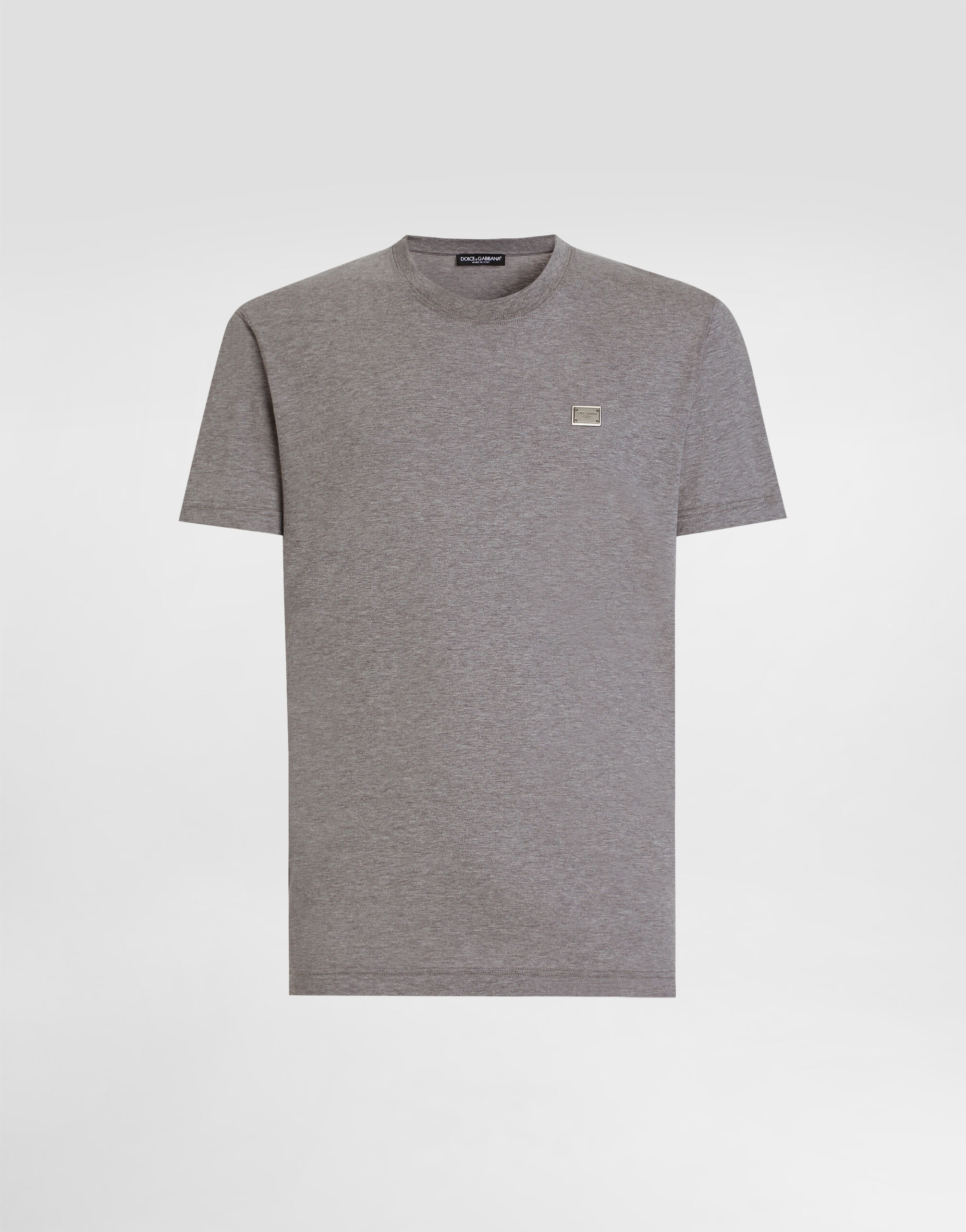 The DNA Men's Collection reimagines daily wear with bold contrasts, meticulous details, and innovative silhouettes. Outerwear stands out with clean lines and high-tech materials, merging sportiness with sophistication in sweaters, sweatshirts, and trousers. A striking color palette, including Black Sicily, caramel, cream, burgundy, and stone gray, pairs with iconic prints like Leopard and Polka dots, enhancing the collection's authentic and refined look. Cotton jersey T-shirt with metal branded tag: • Gray • Classic fit • Knit neck, sleeves and hem • Short sleeves • Metal Dolce&Gabbana branded tag • The piece measures 71.5 cm from the shoulder seam on a size IT 48 • Made in Italy External composition: 100% Cotton