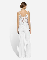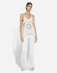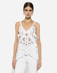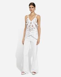 The Italian summers of the 1960s, the candid purity of white, the sophisticated elegance of the jet set of that era. The imagery of the FW24/25 Capri Collection encapsulates all this flawlessly. The pieces range from floaty poplin silhouettes or sack-style dresses and skirts, to brocade outerwear and floral-inlay fabric shirts. The iconic bags – the Logo Bag, the Sicily Bag and the Dolce Box – complement the looks, while the shoes come embroidered with designs inspired by the crystal-clear sea of Capri. Cotton top with cut-out detailing: • White • Straight neckline • Sleeveless with shoulder straps • Unlined • Side zipper and hook fastening • The piece measures 34.5 cm from the center back on a size IT 40 • The model is 175 cm tall and wears a size IT 40 • Made in Italy External composition: 100% Cotton